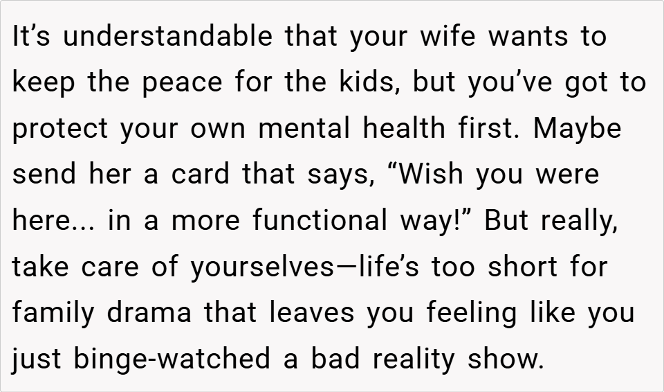 Reddit users overwhelmingly sided with OP, labeling the SIL a “toxic liar” and urging legal recourse. Critics questioned missing details but conceded SIL’s actions were indefensible. A minority empathized with the wife’s desire to see the kids but stressed: “Don’t set yourself on fire to keep others warm.”
