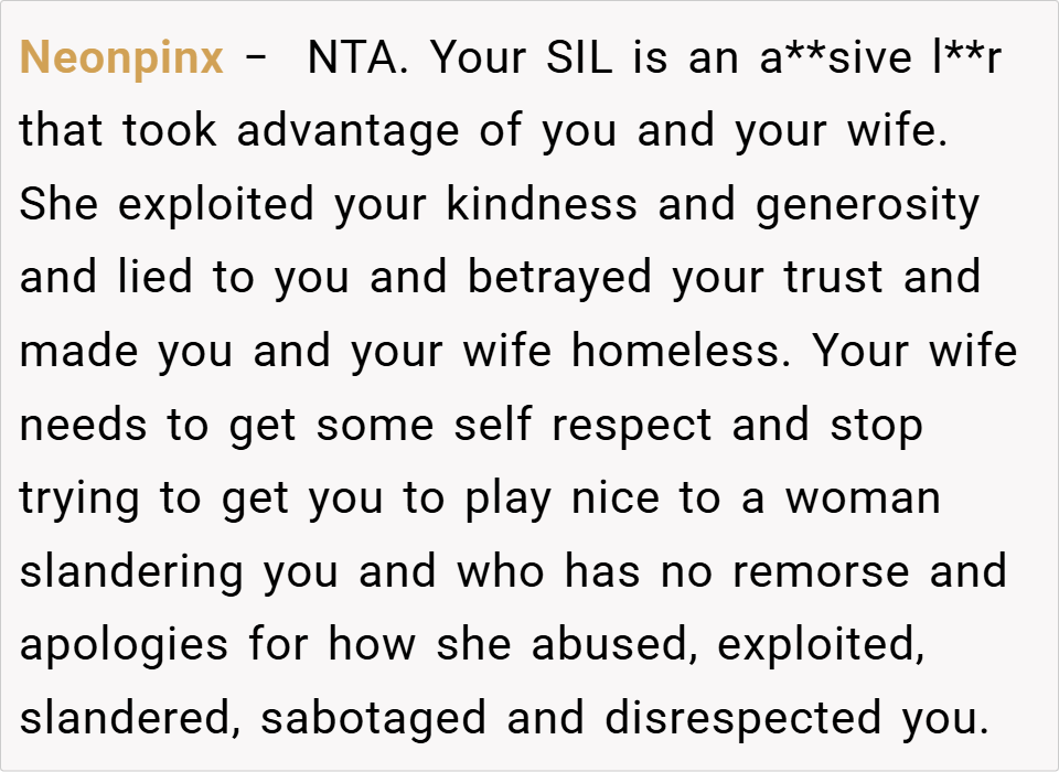 This isn’t a simple family spat—it’s a case of systemic exploitation. SIL’s entitlement, dishonesty, and refusal to acknowledge OP’s sacrifices reveal a profound lack of respect. While the wife’s hope for reconciliation is understandable, rebuilding trust with SIL is neither safe nor advisable without accountability.