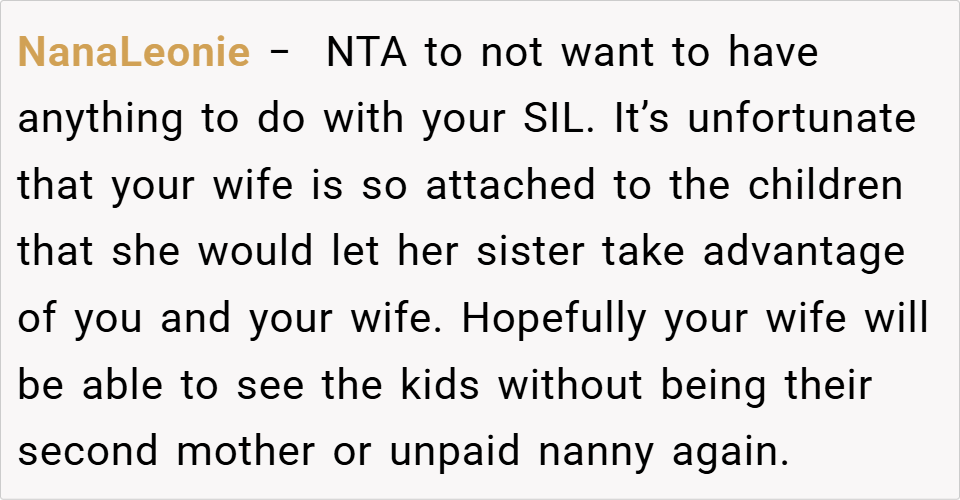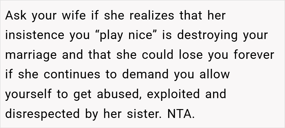 Relationship coach Dr. Tammy Nelson advises: “OP’s wife must prioritize her marriage over her sister’s demands. SIL’s behavior isn’t just toxic—it’s a threat to their union. Couples therapy is critical to align their priorities.”