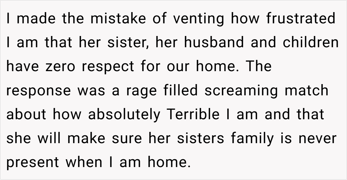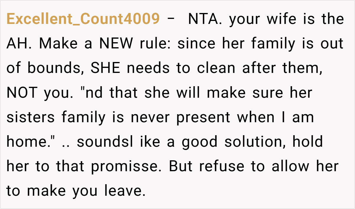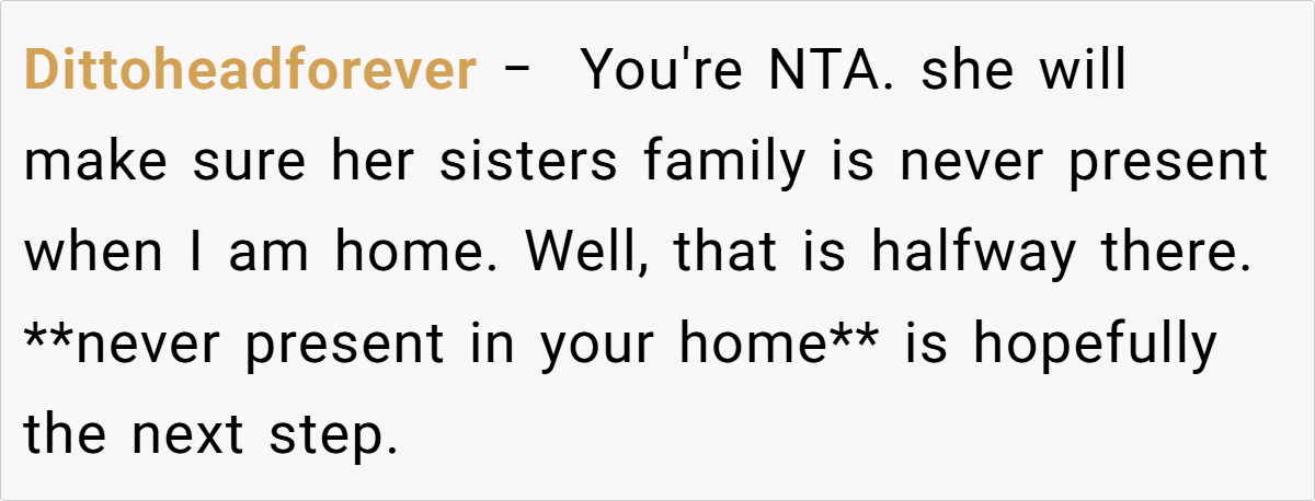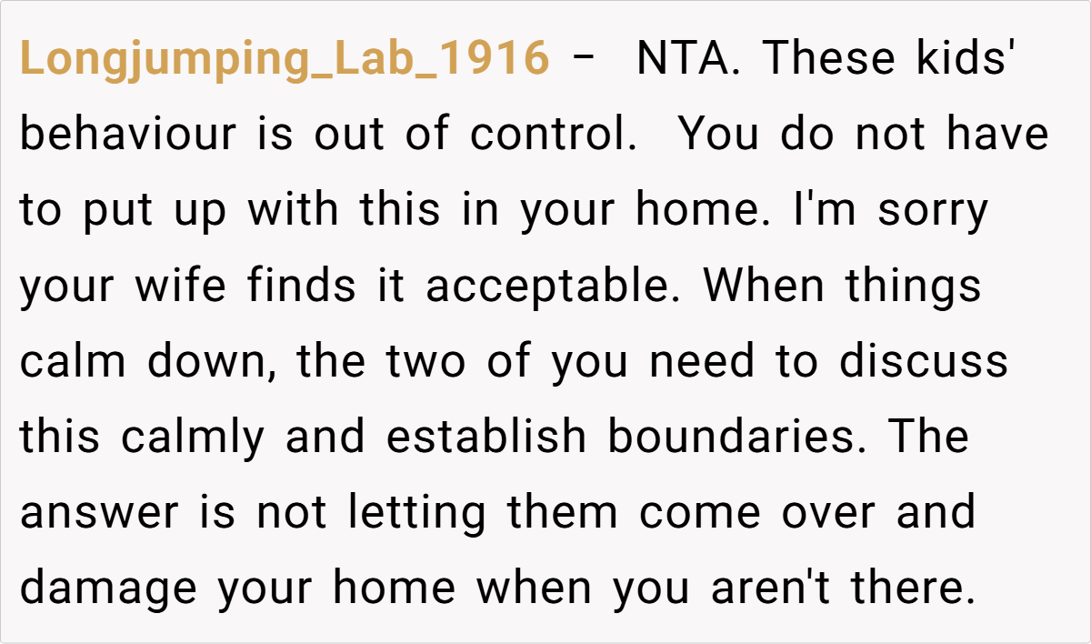 When household boundaries are consistently breached, it can lead to serious emotional and relational strain. According to family therapist Dr. Susan Johnson, “A home should be a sanctuary where all family members feel safe and respected. When external factors, such as disruptive behavior from guests, compromise that space, it’s crucial to establish clear boundaries and consistent expectations.” In the OP’s case, the repeated episodes of unruly behavior by his wife’s sister’s children not only cause physical damage but also erode the sense of respect and comfort in his own home.