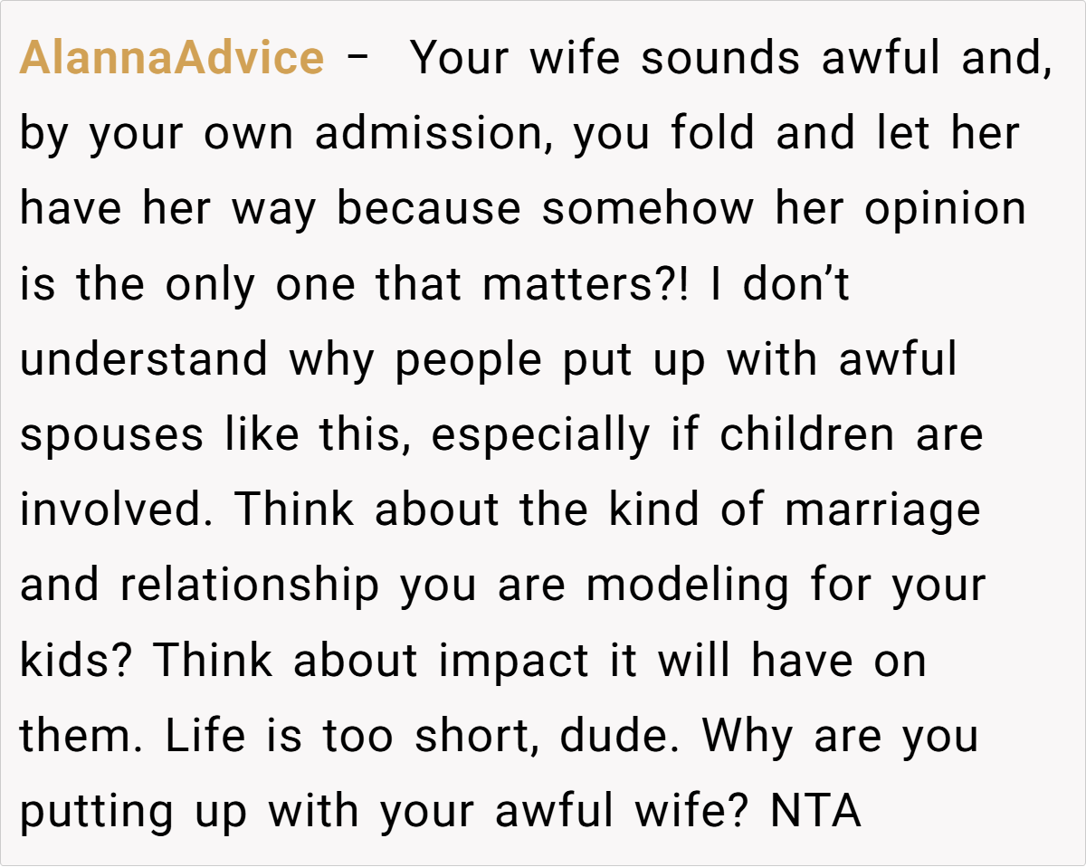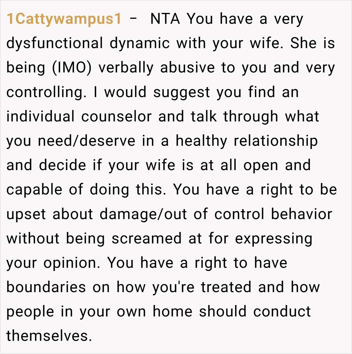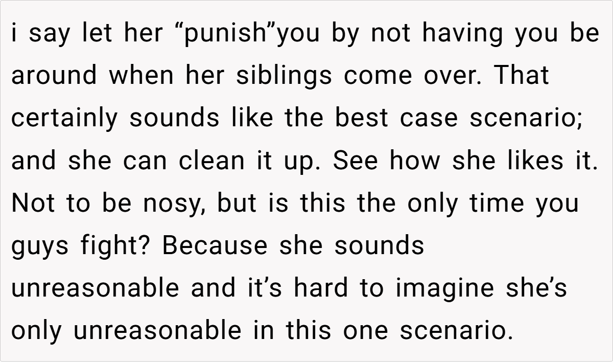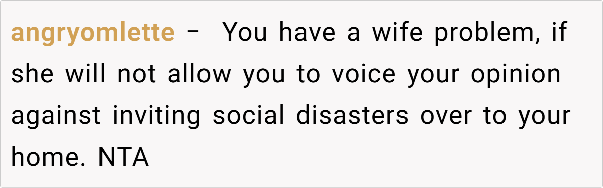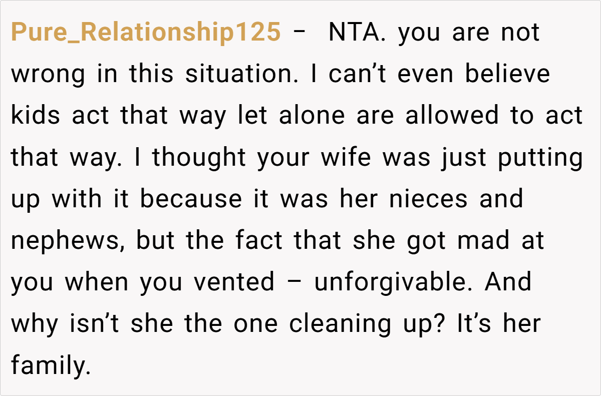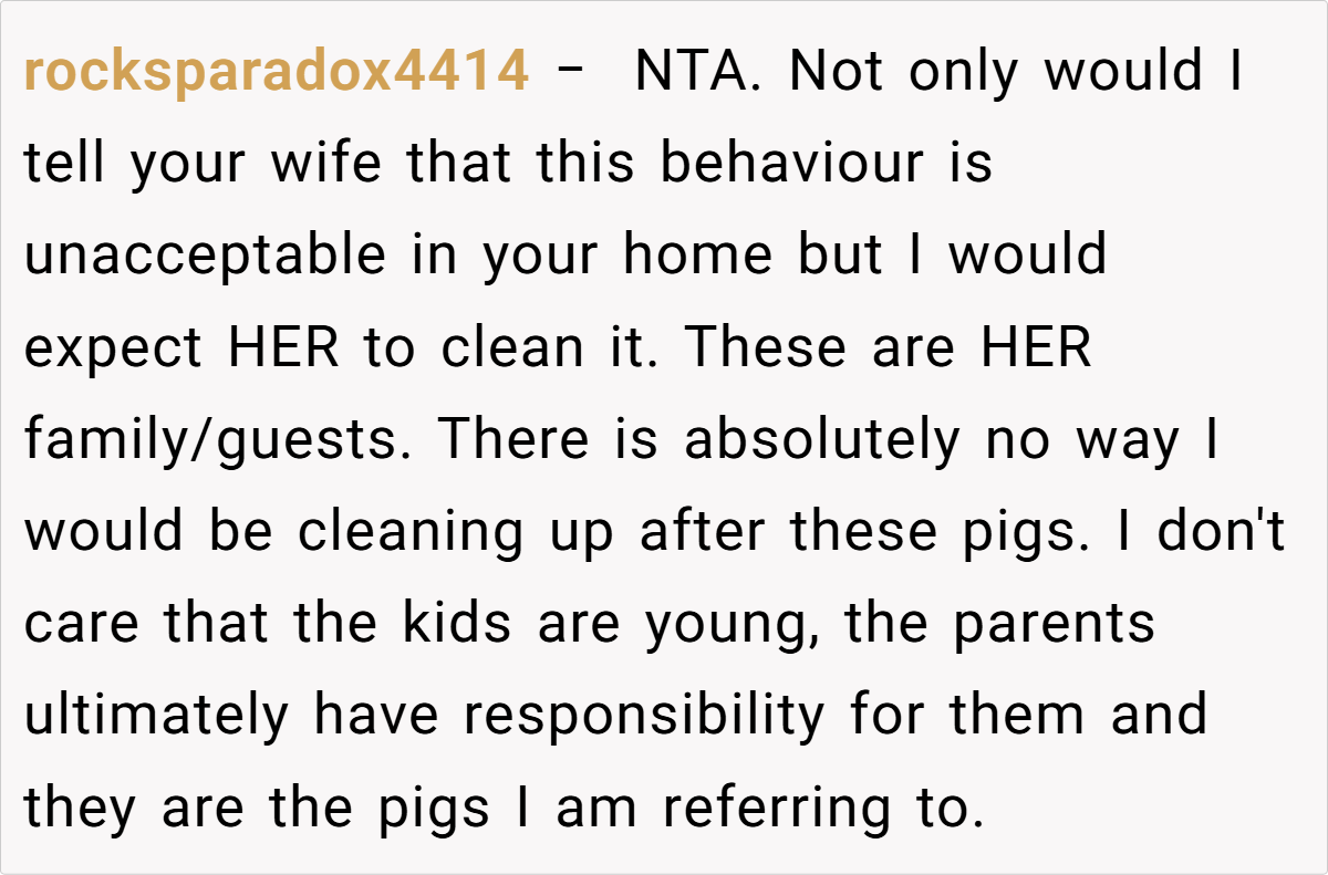 The Reddit community has overwhelmingly sided with the OP. Many commenters criticized the wife’s leniency and the lack of accountability on the part of her family. They argue that allowing children to run wild and damage property is unacceptable, regardless of familial ties, and that it is entirely reasonable for the OP to expect his home to be respected. Numerous users pointed out that the onus should fall on the adults—especially the parents—to ensure that their children behave appropriately during gatherings.