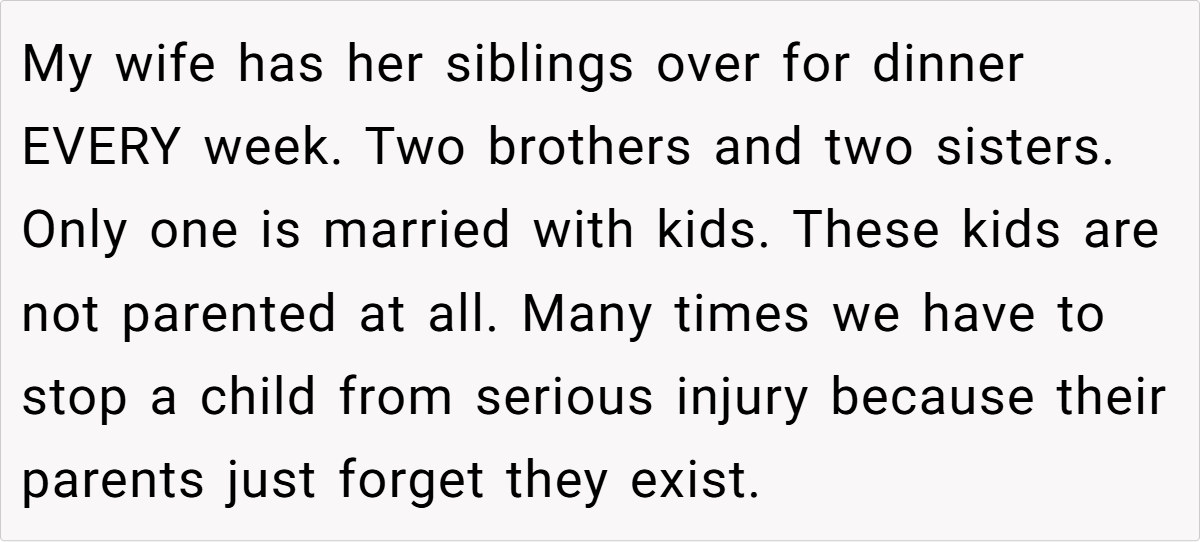 Family gatherings should be a time to relax, connect, and celebrate, yet sometimes they become the stage for chaos and conflict. The OP’s story illustrates a recurring issue during weekly family dinners when his wife’s siblings visit. Instead of enjoying a calm evening, the OP finds himself battling the disruptive behavior of unparented children who run amok in his home. The situation escalates to the point where a simple family celebration turns into a scene of property damage, leaving the host frustrated and his patience worn thin.