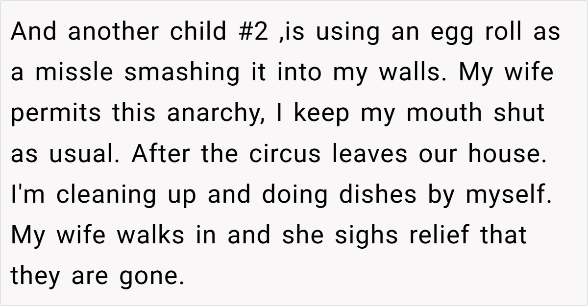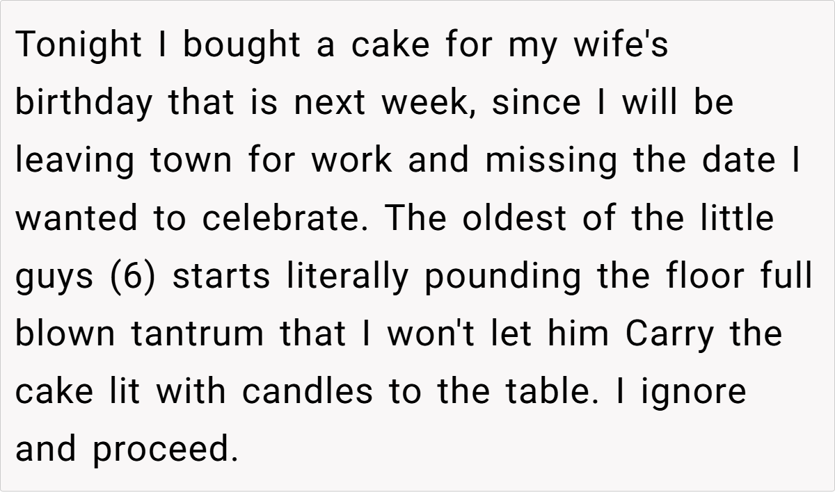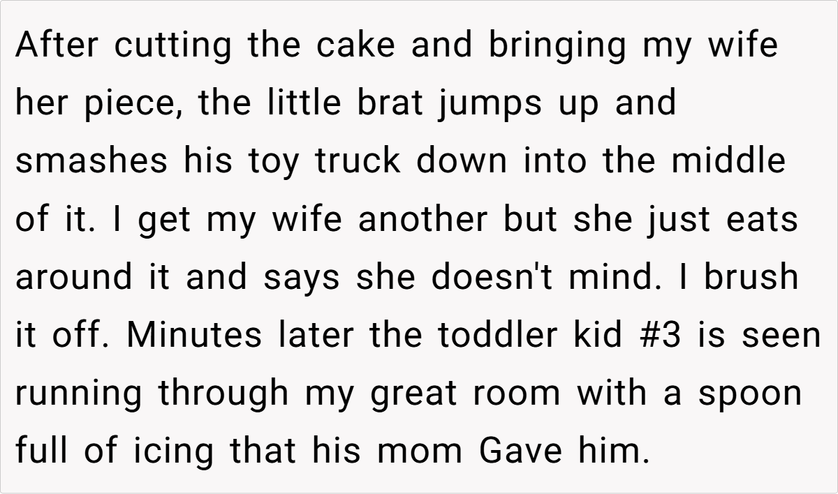 After enduring a series of incidents—from a tantrum over a birthday cake to children using food as projectiles—the OP reaches a breaking point. His attempt to voice his concerns over the disorder and disrespect shown in his own home sparks a fierce argument with his wife. What ensues is a conflict about boundaries, responsibilities, and respect within a marriage, leaving both parties and extended family members reeling from hurtful words and unmet expectations.