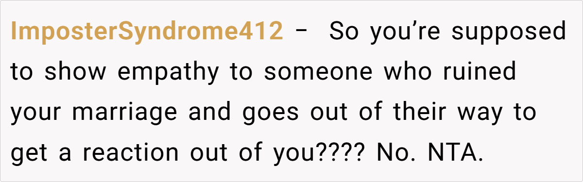 She isn’t obligated to shoulder any emotional responsibility for her ex or his new partner. This post examines whether her no-nonsense attitude in this volatile family landscape makes her an AH or if she’s simply protecting herself from further hurt.