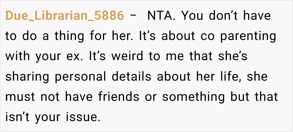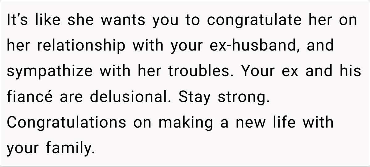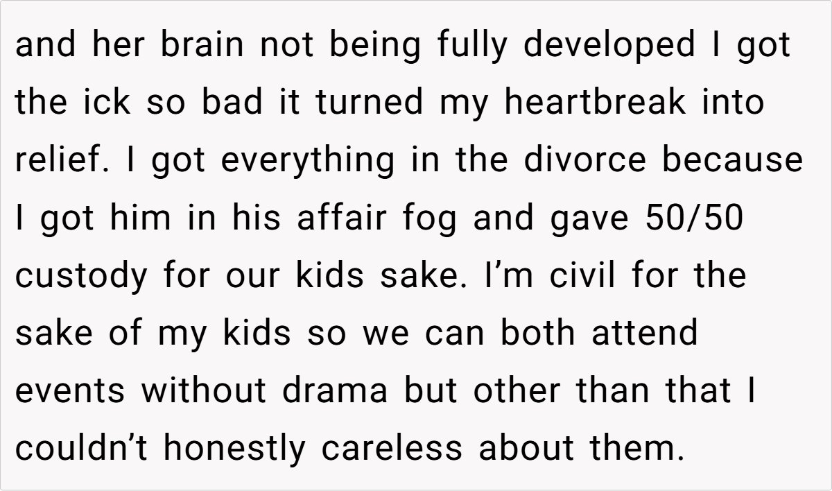 “You are not obligated to extend compassion beyond what is necessary for mutual respect or for the sake of the children,” he notes. For our storyteller, her blunt honesty was a way to reclaim her emotional space and to signal that she’s not willing to rehash old wounds or support a relationship that no longer exists.