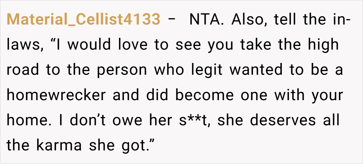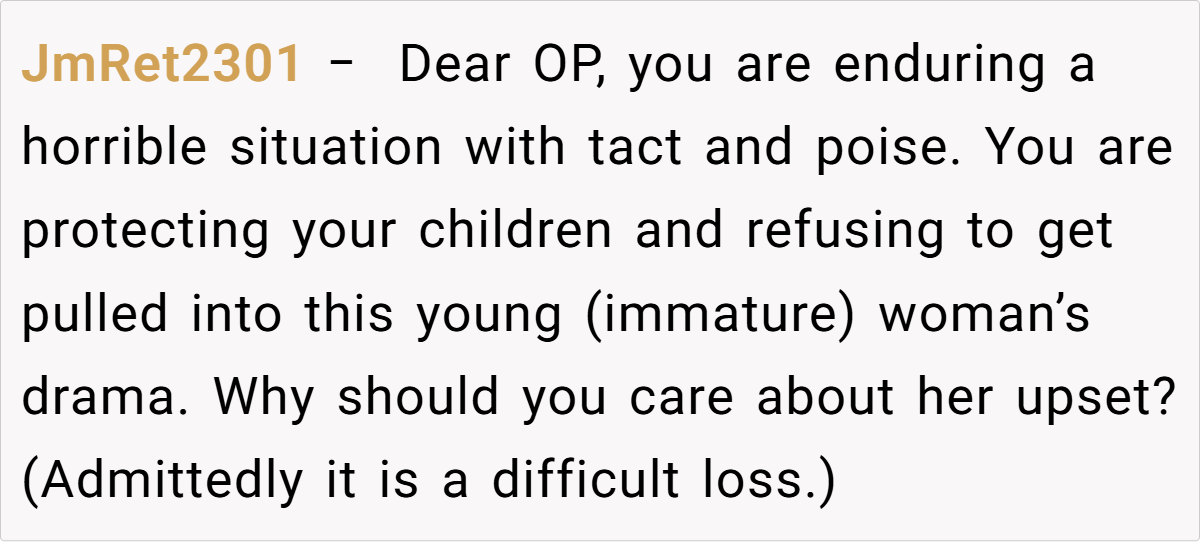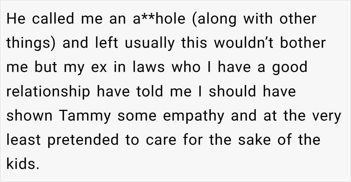 On the other hand, some commenters suggest that for the sake of the children and maintaining a semblance of civility, showing at least a modicum of empathy might help ease tensions over time. However, a common thread among most responses is that she is well within her rights to prioritize her own healing and protect her emotional boundaries.