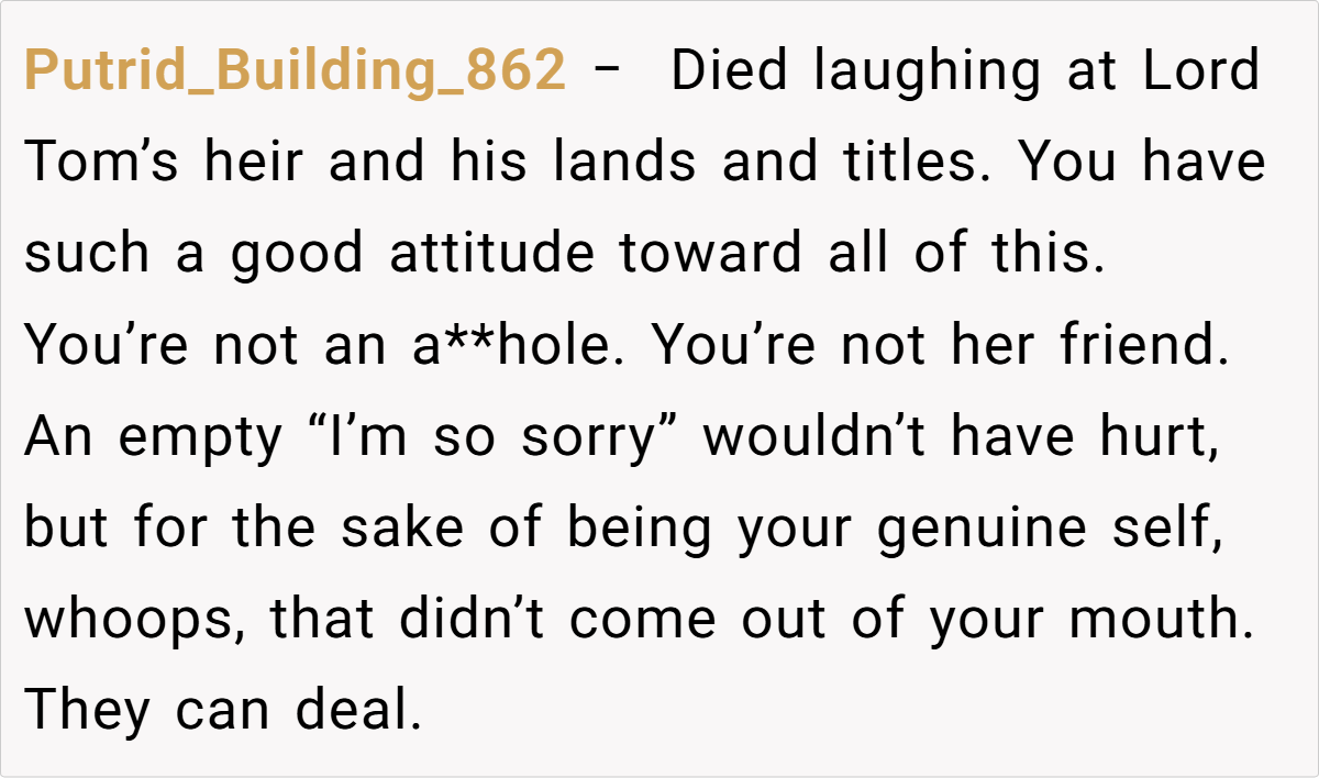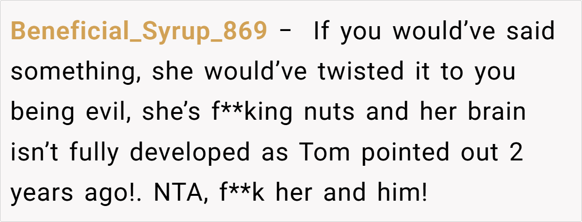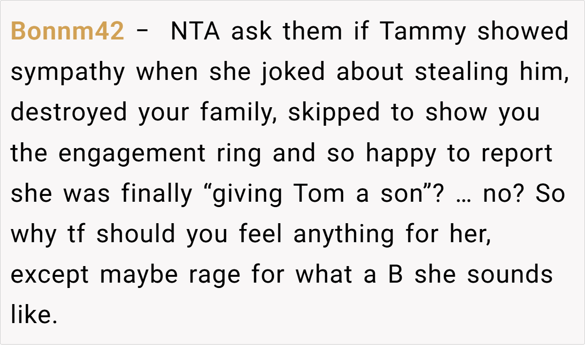The Reddit community’s reactions have been mixed. Many users resonate with her perspective, applauding her for drawing a firm line after years of feeling sidelined by Tom and Tammy’s actions. They argue that if you’re no longer in a relationship with someone, you shouldn’t have to care about their current choices—especially if those choices continue to hurt you.