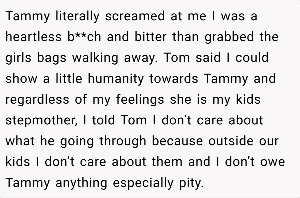 When past relationships fracture into messy new dynamics, it’s natural for lingering emotions to spill over—sometimes into blunt honesty. In this update, our storyteller, a 36‑year‑old mother, explains why she told her ex-husband, Tom, that she doesn’t care about his life—and that she owes his fiancé, Tammy, nothing (especially not pity).