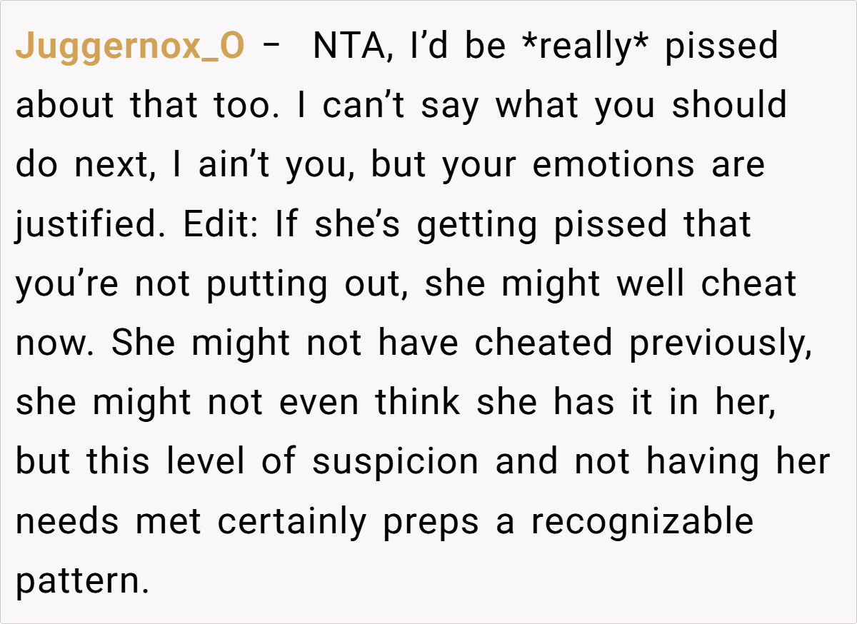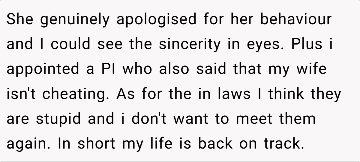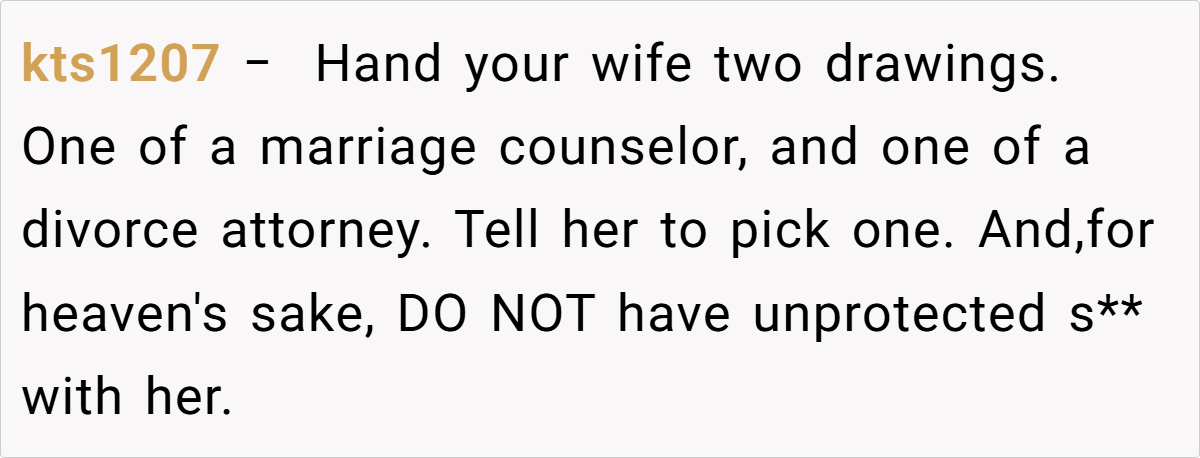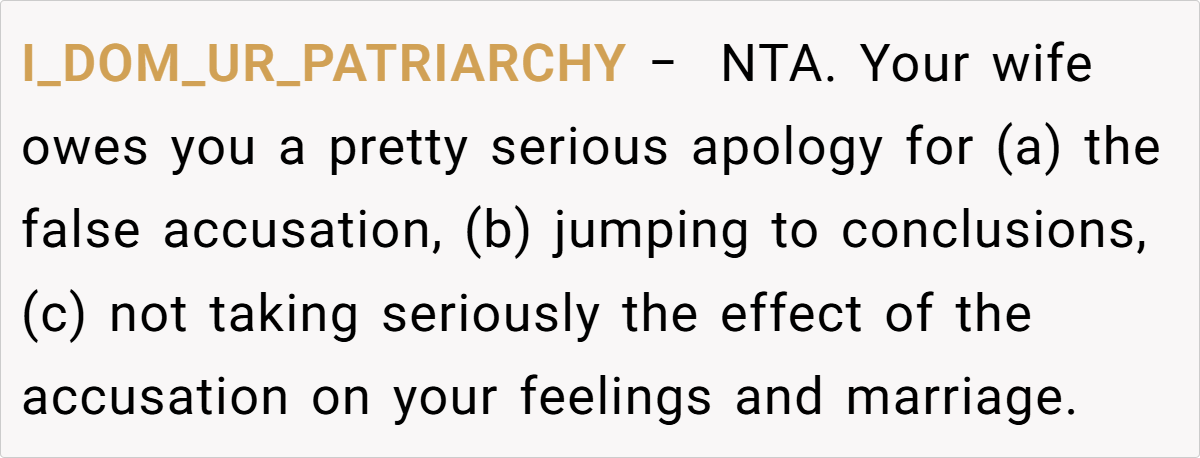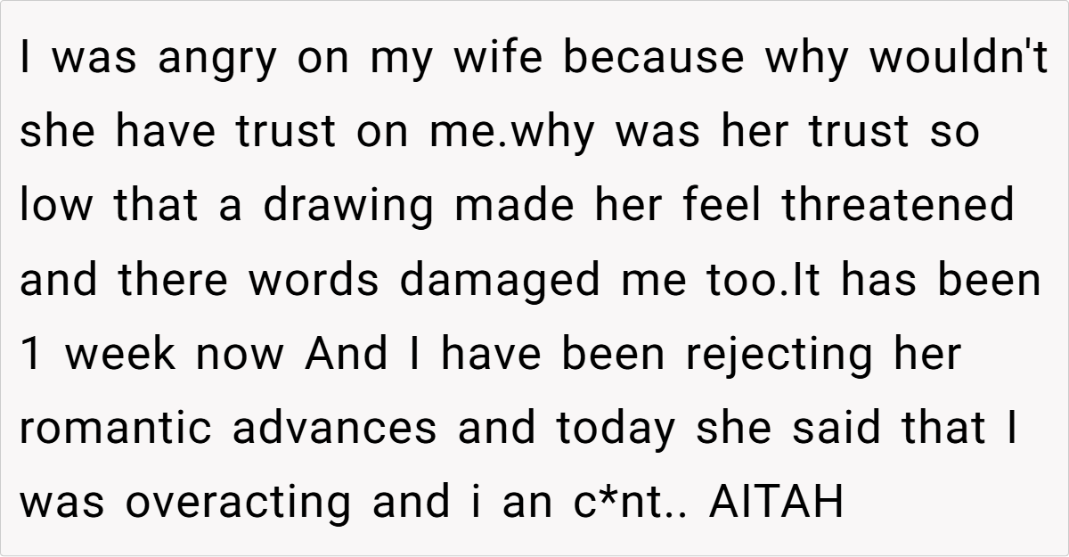 The husband’s frustration is understandable: being accused without any concrete evidence and having his character maligned over a simple drawing is not only hurtful—it undermines the mutual respect essential for any healthy relationship. By hiring a PI and verifying his fidelity, he has taken responsible steps toward clarifying the misunderstanding. However, healing now requires more than evidence—it demands honest dialogue about each partner’s vulnerabilities and past hurts.