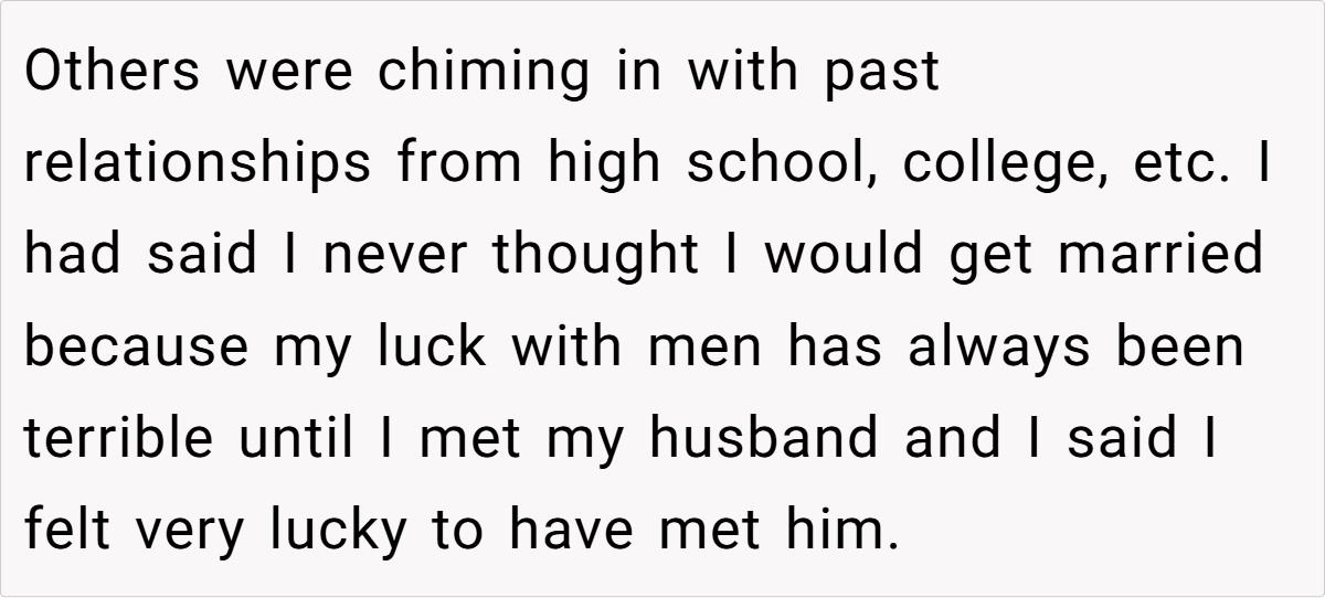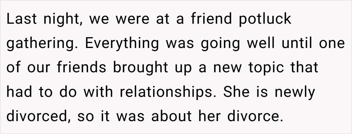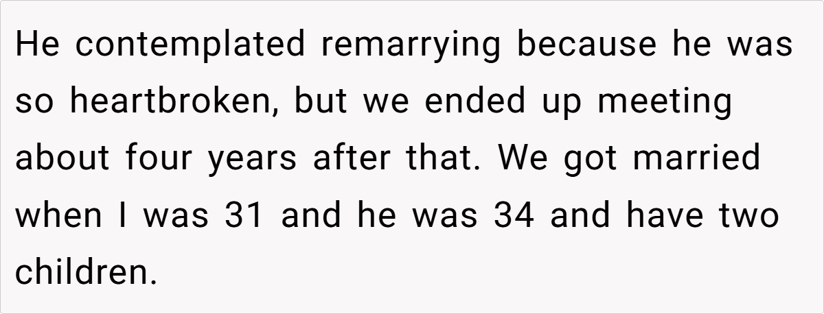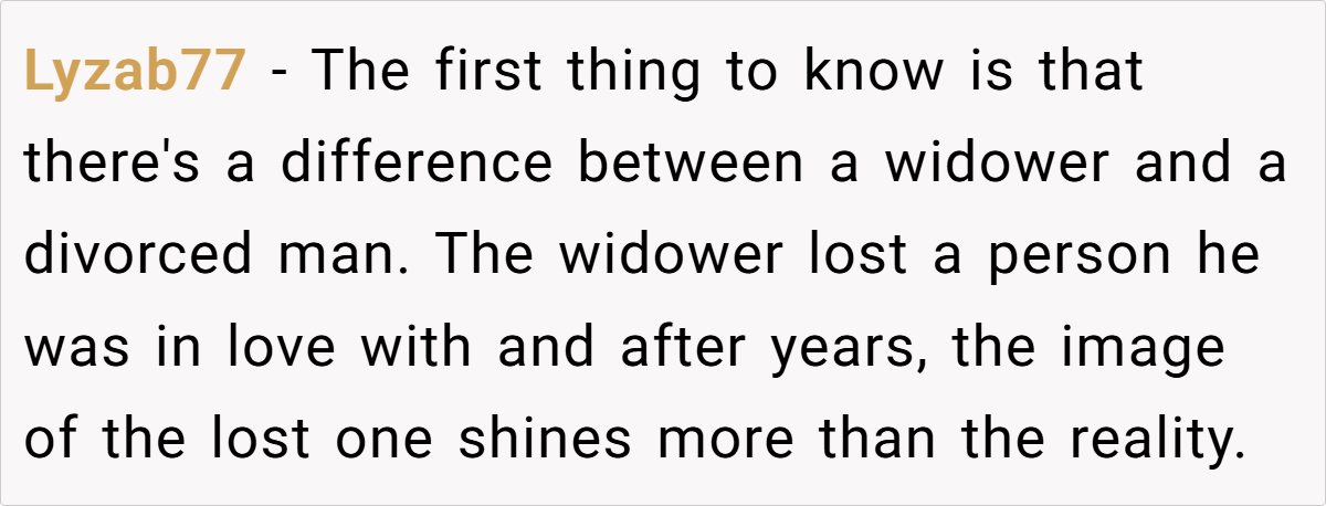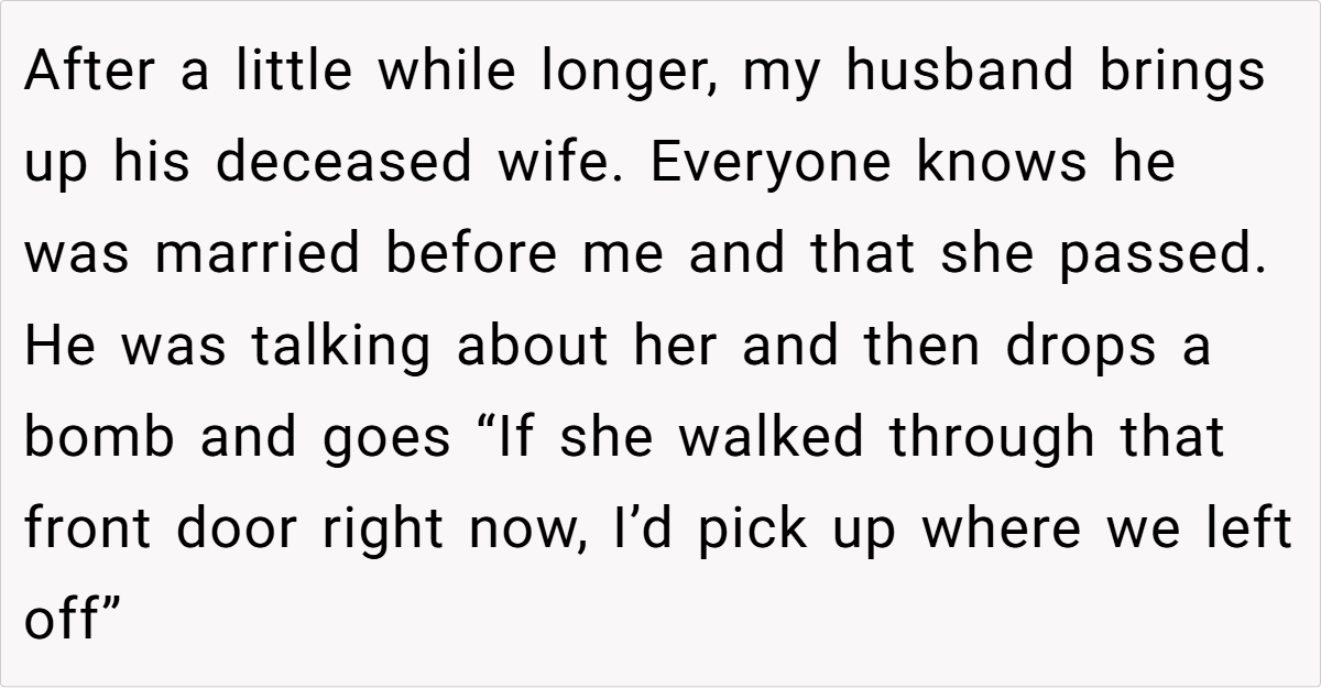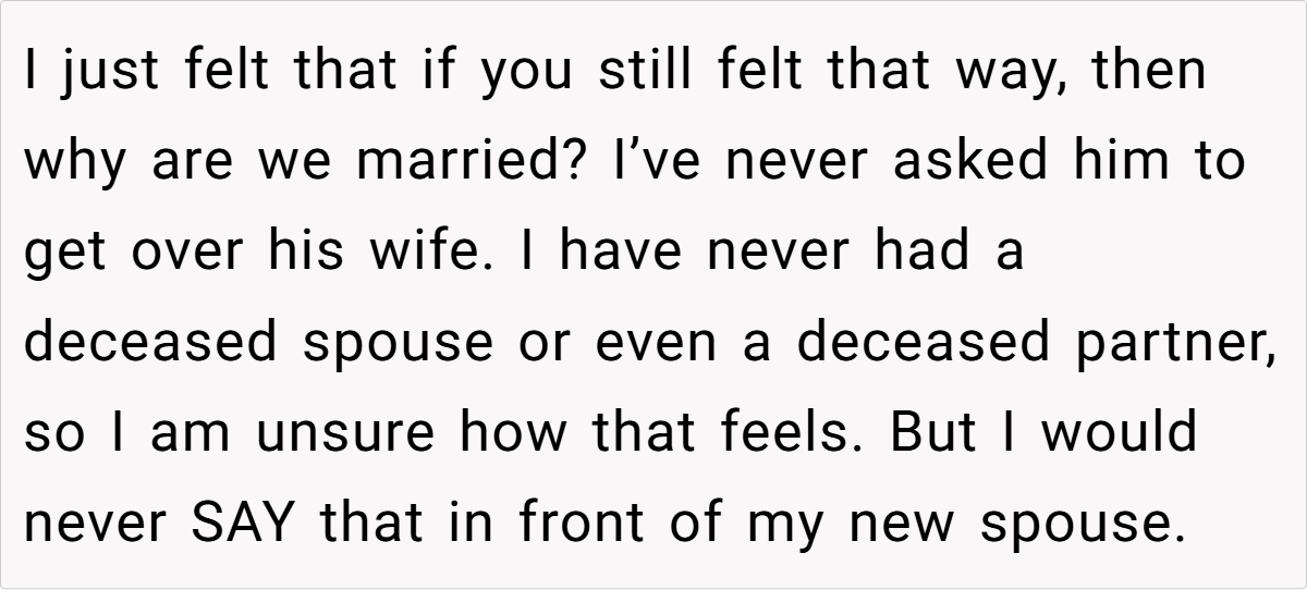 In this case, the OP’s husband casually remarked—during a friend potluck—that he’d resume his relationship with his deceased wife if she reappeared. This comment, made in a public setting, struck the OP as deeply hurtful and insensitive. It reveals a stark contrast between her expectation of exclusive emotional commitment and his lingering attachment to a past love, highlighting a painful dissonance that disrupts their marital harmony.