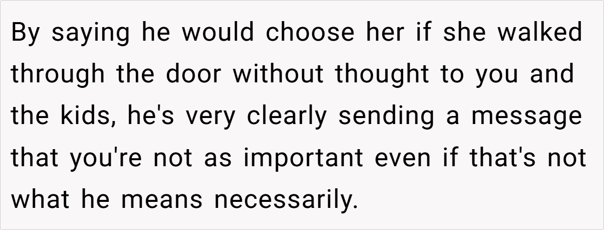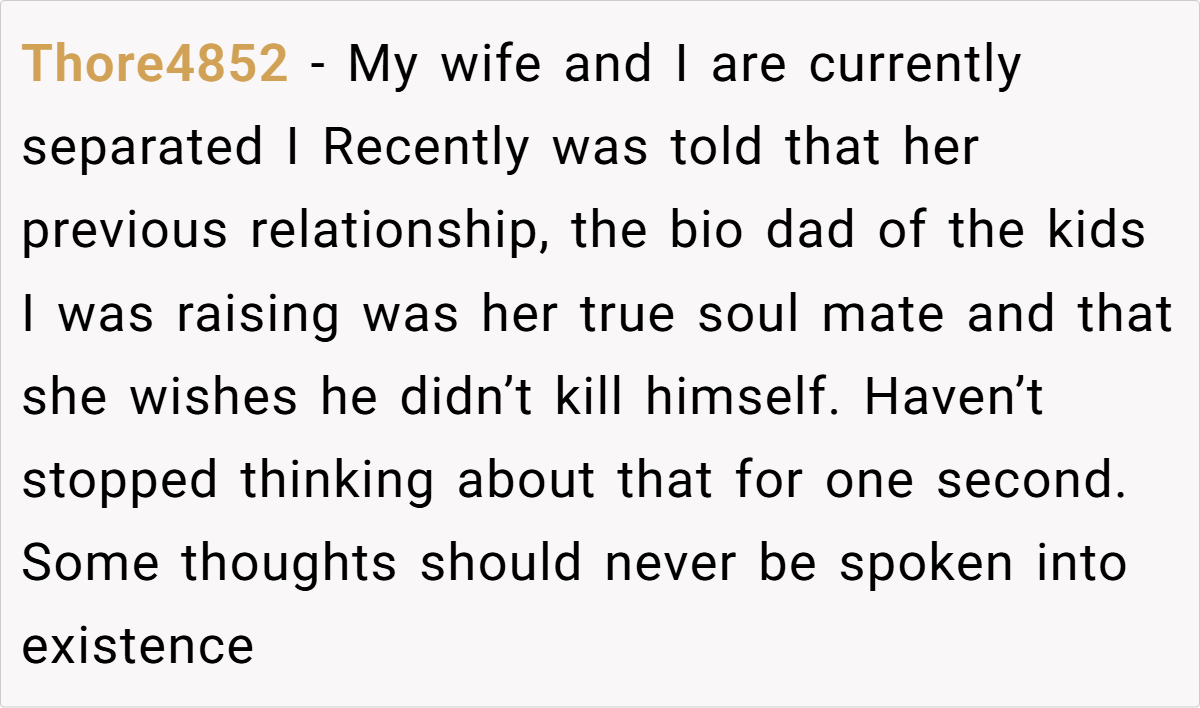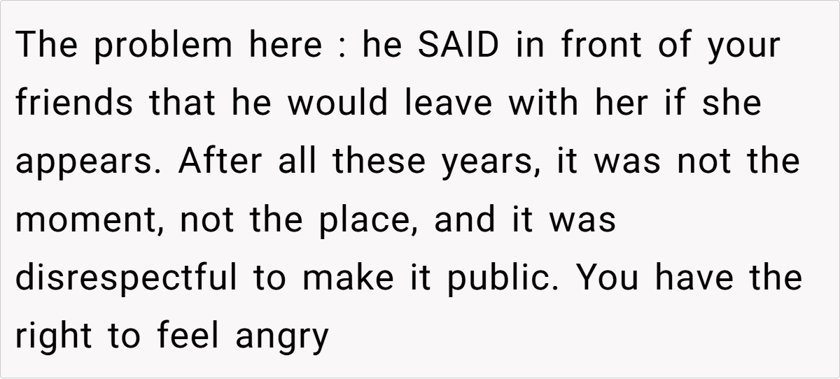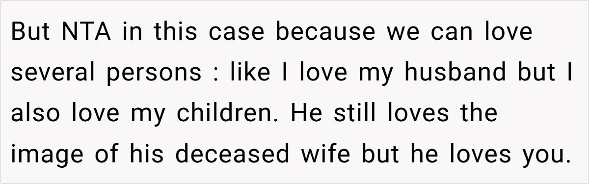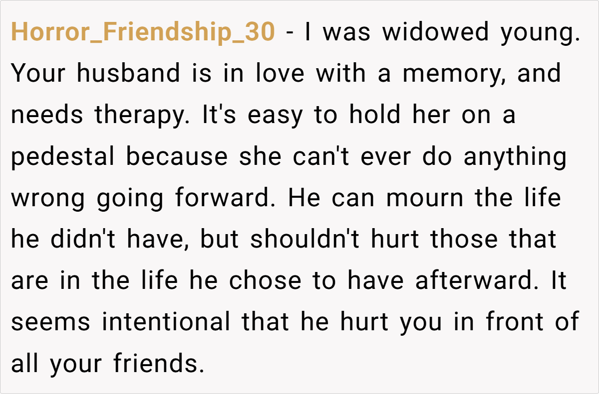 The OP’s reaction is entirely understandable. She has built a life with her husband and their two children, and his offhand comment in front of friends made her feel devalued and emotionally sidelined. While she acknowledges that grief is a personal process, she expected that such intimate feelings would be managed privately rather than broadcast in a social gathering. Conversely, the husband’s behavior suggests that he may not have fully reconciled his past loss, instead letting old wounds manifest in ways that inadvertently hurt his current partner.