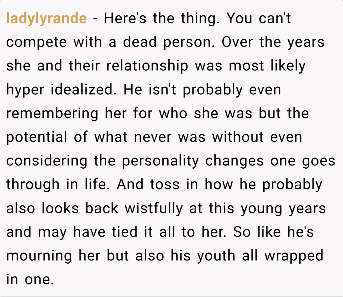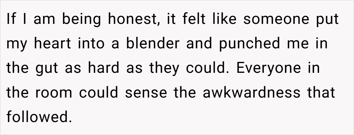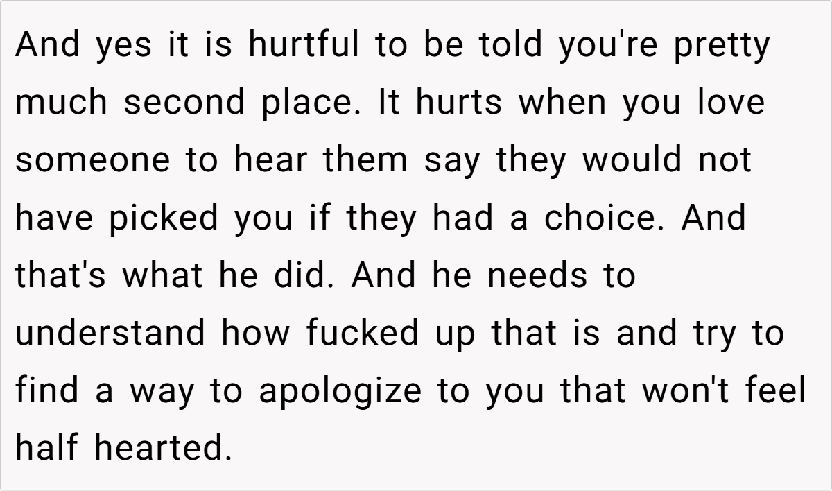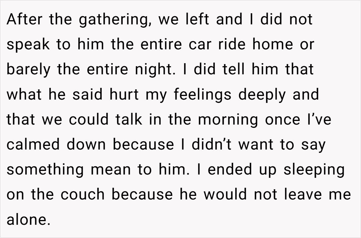 The OP’s reaction is entirely understandable. She has built a life with her husband and their two children, and his offhand comment in front of friends made her feel devalued and emotionally sidelined. While she acknowledges that grief is a personal process, she expected that such intimate feelings would be managed privately rather than broadcast in a social gathering. Conversely, the husband’s behavior suggests that he may not have fully reconciled his past loss, instead letting old wounds manifest in ways that inadvertently hurt his current partner.