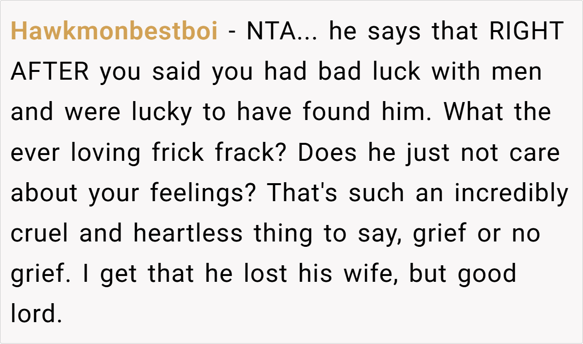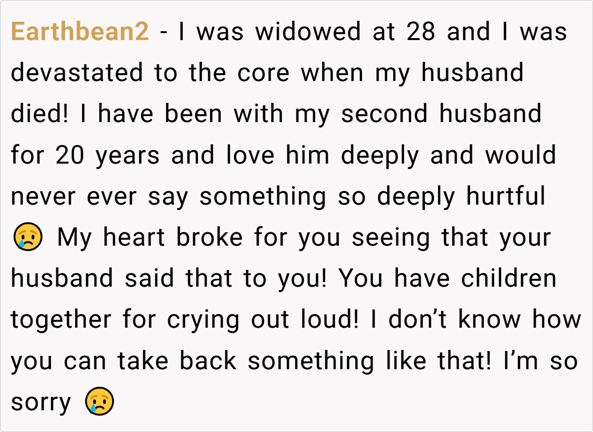 In summary, many readers find the husband’s remark deeply hurtful and inappropriate, reflecting unresolved grief and poor communication.