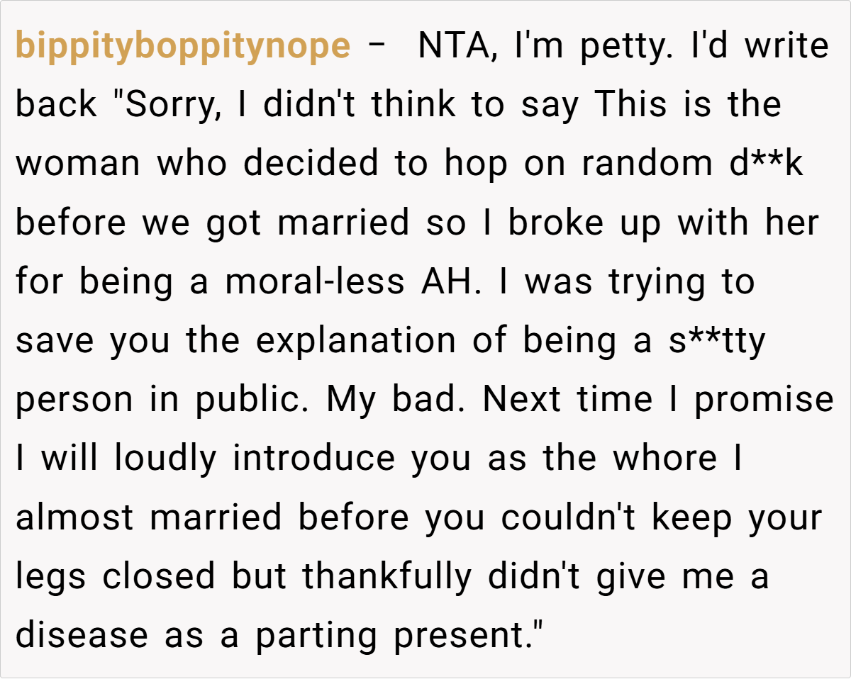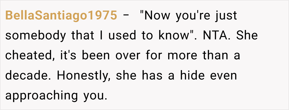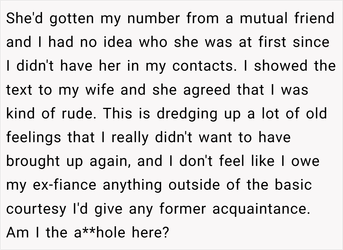 Here are some hot takes from the Reddit community—candid and often humorous reflections on an awkward blast from the past. Commenters overwhelmingly agree that the OP is NTA. They argue that after being hurt and betrayed, it’s entirely reasonable to offer nothing more than a polite, factual response. Many find the ex-fiancée’s expectations laughably entitled, insisting that the past should remain in the past. This consensus underscores that respecting your present doesn’t mean catering to the unresolved issues of yesterday.