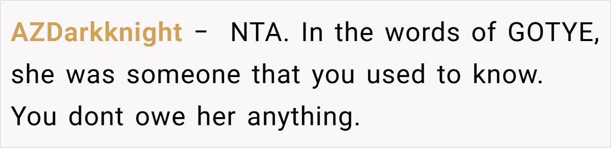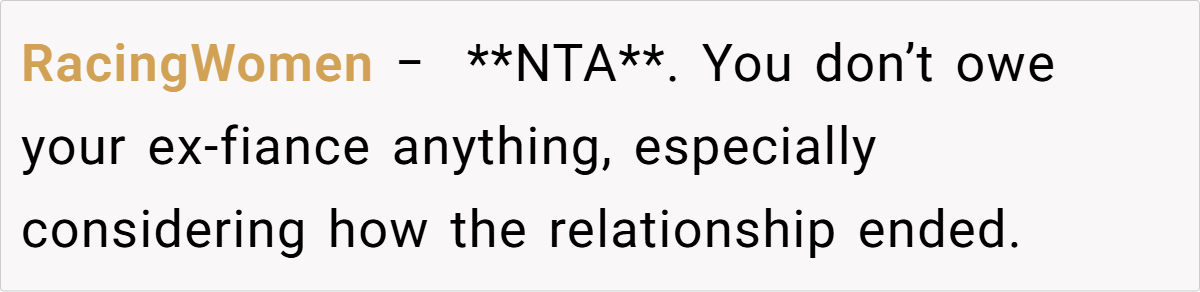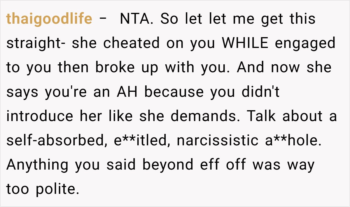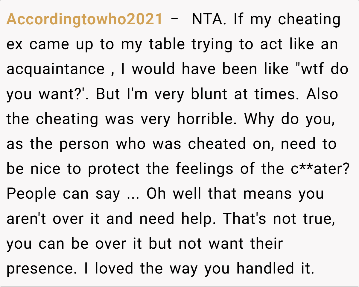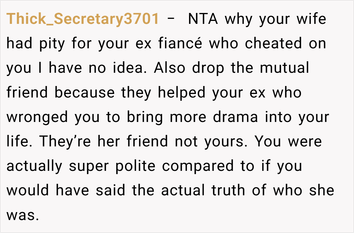 Here are some hot takes from the Reddit community—candid and often humorous reflections on an awkward blast from the past. Commenters overwhelmingly agree that the OP is NTA. They argue that after being hurt and betrayed, it’s entirely reasonable to offer nothing more than a polite, factual response. Many find the ex-fiancée’s expectations laughably entitled, insisting that the past should remain in the past. This consensus underscores that respecting your present doesn’t mean catering to the unresolved issues of yesterday.