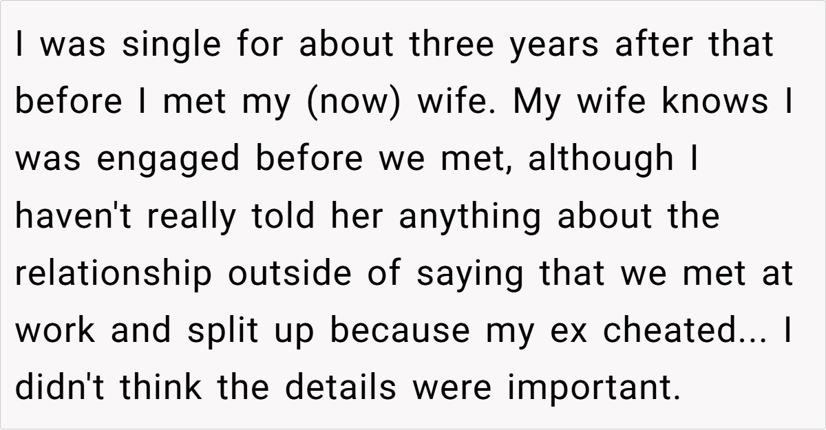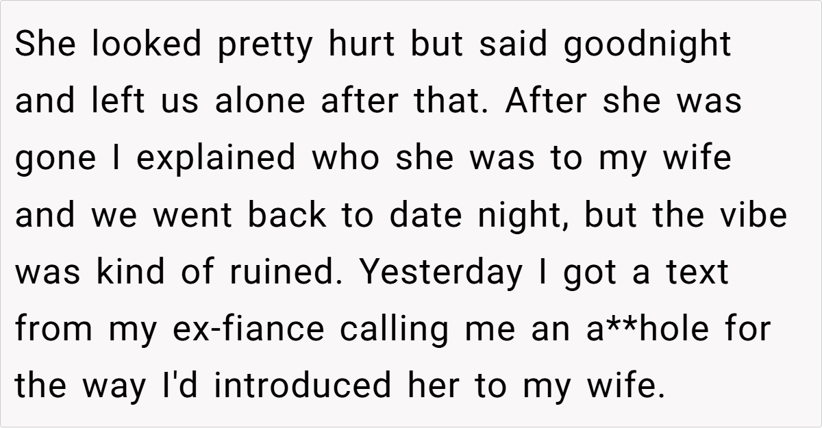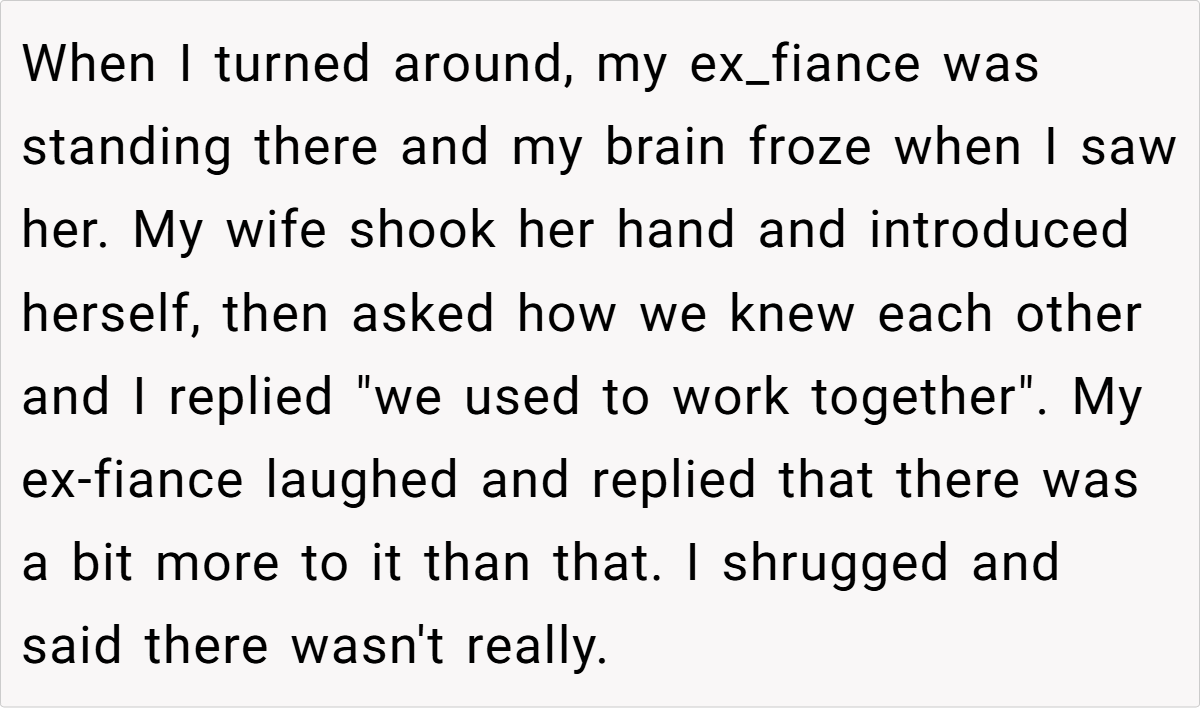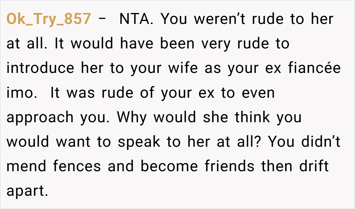 Navigating encounters with exes can be a delicate matter, especially when the past involves deep emotional scars. In this case, the OP’s unexpected run-in with his ex-fiancée—whose betrayal once cut deeply—undoubtedly dredged up old feelings he thought he had left behind. The shock of seeing someone from a painful chapter of life can be disorienting, even when you’ve moved on. In moments like these, it’s perfectly reasonable to keep interactions brief and neutral, preserving the sanctity of your present relationship.