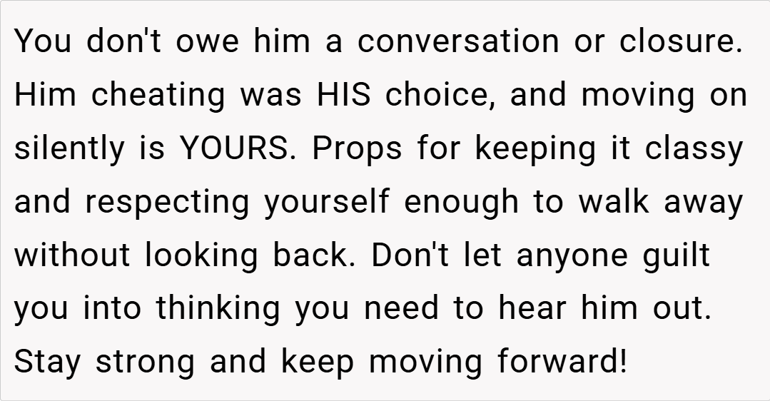 What do you think? Is it fair to cut off communication with a cheater without further discussion, or should there be room for closure, however painful it may be? Share your thoughts and experiences in the comments below—what would you do if you found yourself in a similar situation?