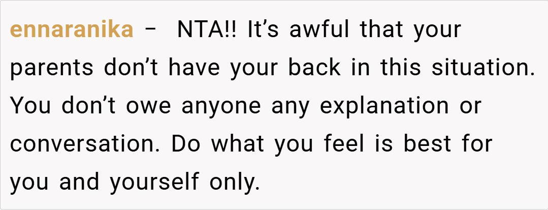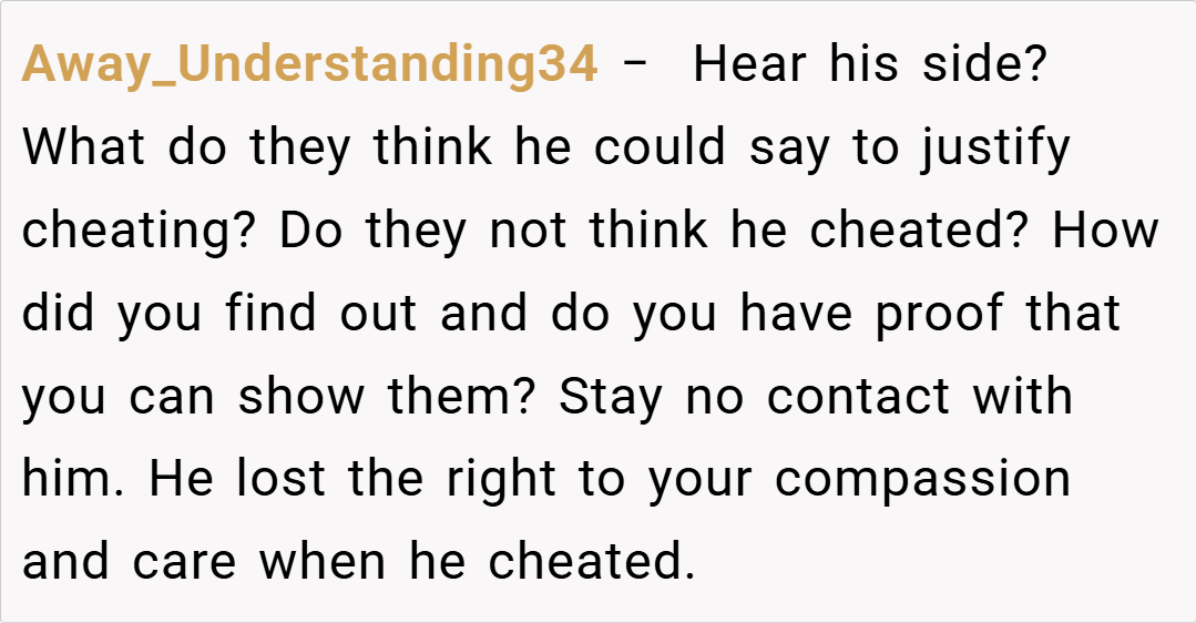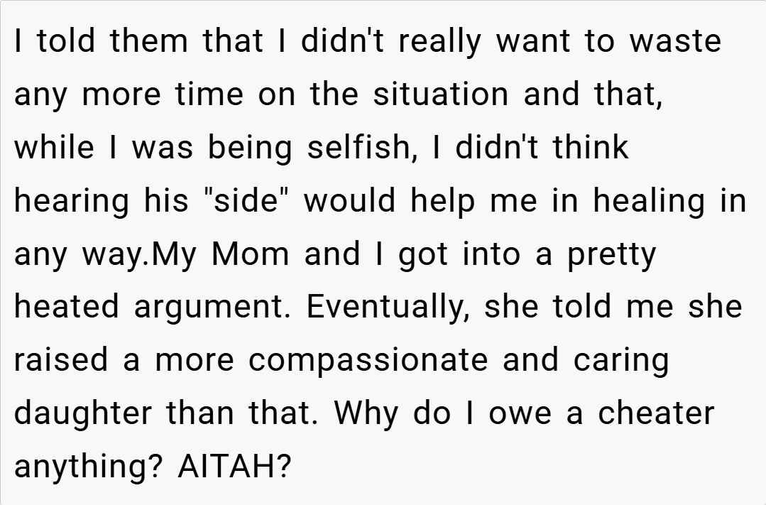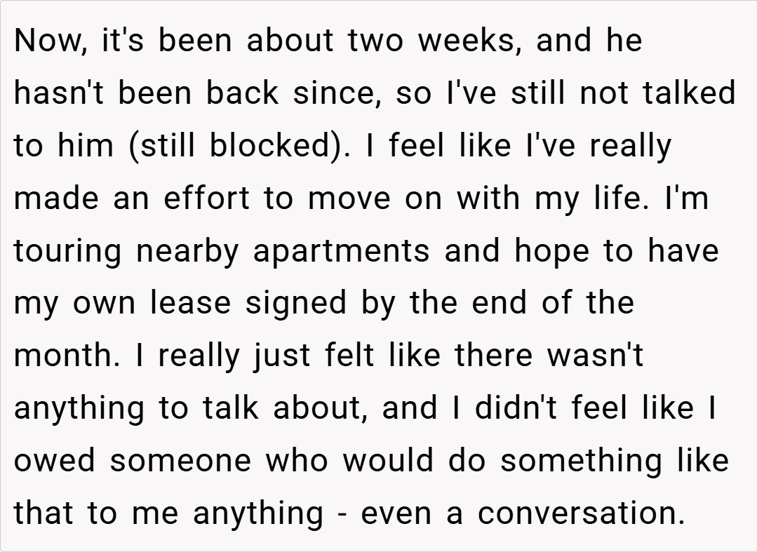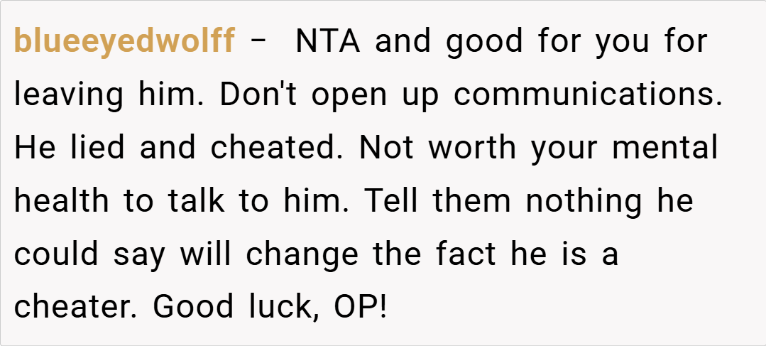 Now, with her parents urging her to reconsider and hear his side, OP stands firm, questioning whether she owes a cheater any explanation at all. As she tours apartments and plans her fresh start, she wonders if her decision to block him and silently move on makes her the asshole—or if it’s the healthiest choice for her future.