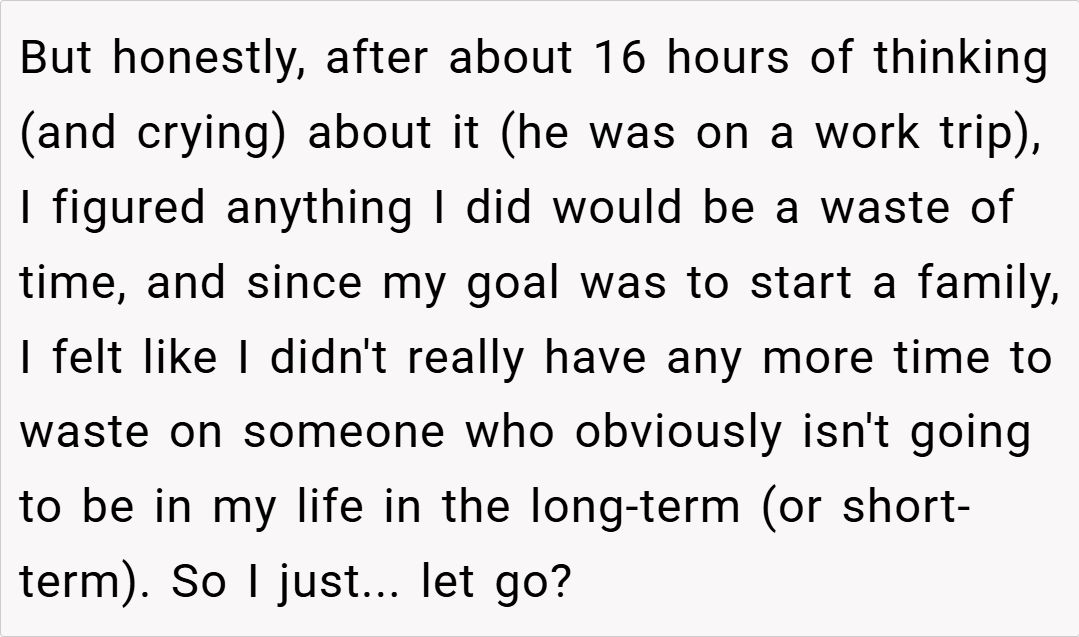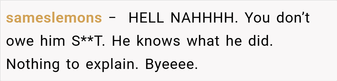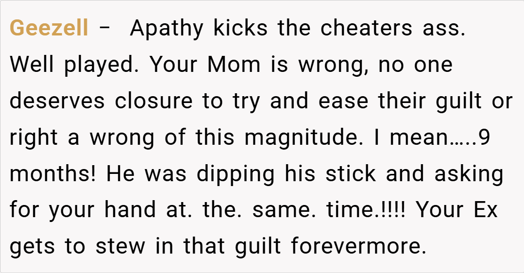 Many redditors empathize with OP, noting that after such a betrayal, moving on without further explanation is not only understandable but sometimes necessary. “If you’ve been cheated on for nine months, you don’t owe that person a second conversation,” one commenter stated.