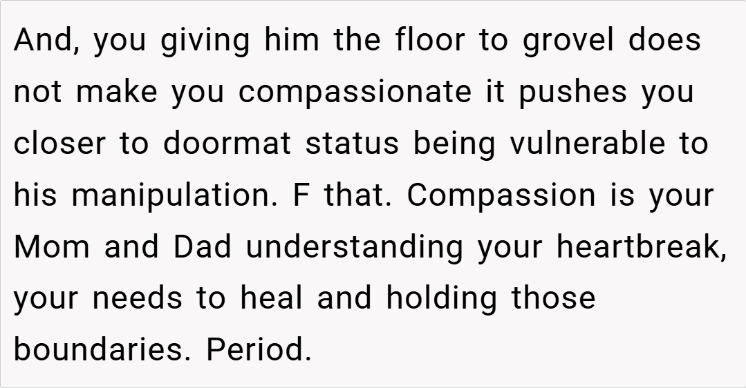 Family therapist Dr. Susan Johnson adds, “Healthy relationships require a foundation of trust and mutual respect. When that trust is shattered, as in cases of prolonged cheating, it’s entirely reasonable to choose to move on rather than try to salvage a relationship built on broken promises. While some may argue for hearing the other side, it’s important to recognize that not every relationship can or should be repaired, particularly when the hurt runs this deep.”