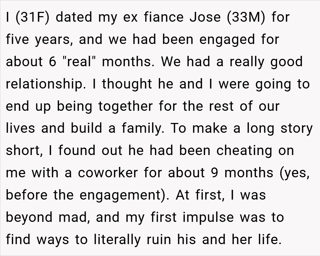 When betrayal strikes, the path to healing can be both personal and uncompromising. Our OP, a 31‑year‑old woman, shares her difficult decision to cut ties with her ex-fiancé after discovering his long-term infidelity. For five years, she believed in their future together—until she found out he had been cheating with a coworker for nine months before their engagement.