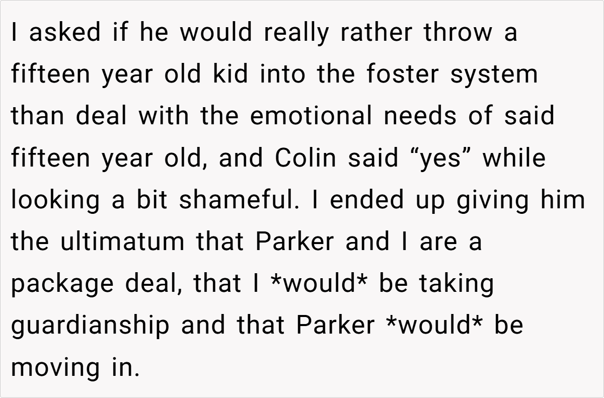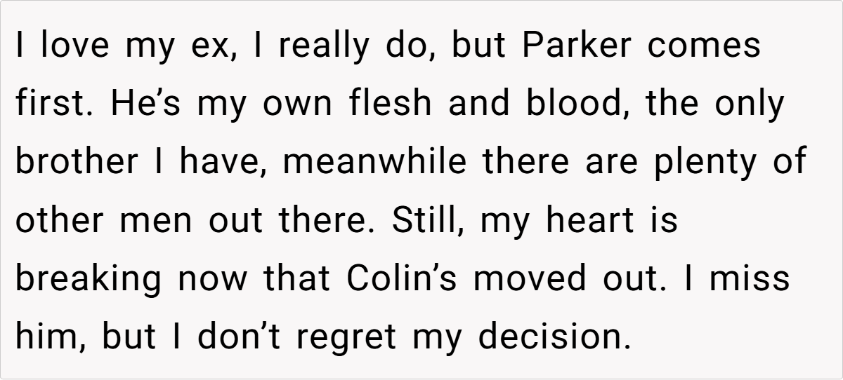 However, when her boyfriend Colin (with whom she had been in a five‑year relationship) balked at the idea of taking on even the minimal “emotional attention” Parker might need, she was forced to choose between her brother’s well‑being and their future together. Now, with Colin packing his bags and many in her friend group siding with him, she’s left wondering if she’s being too harsh—or if she’s simply doing what must be done.