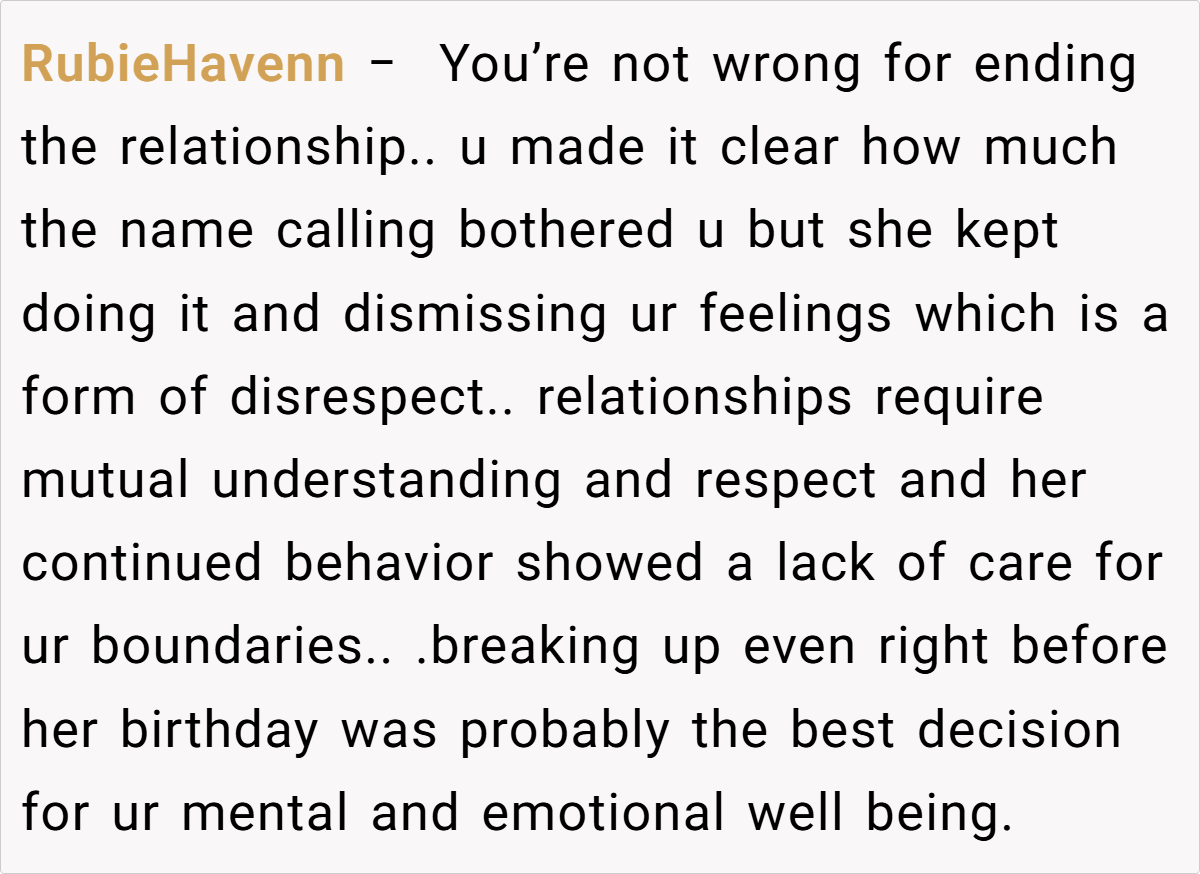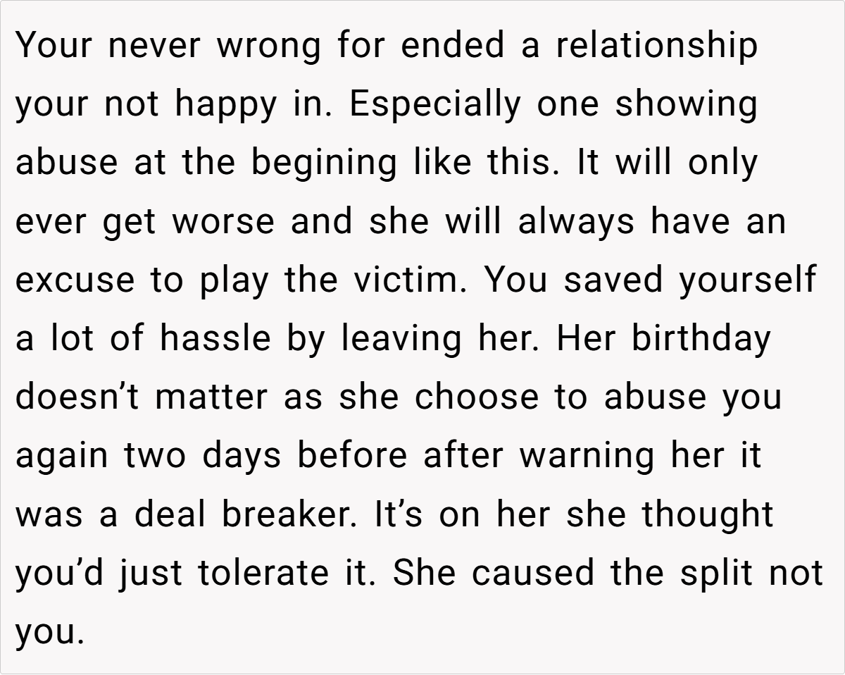 While some sympathized with the emotional difficulty of breaking up close to his partner’s birthday, the prevailing view was that self-respect and mental well-being should always come first. In essence, the community felt that prioritizing one’s own emotional health is both justified and necessary.