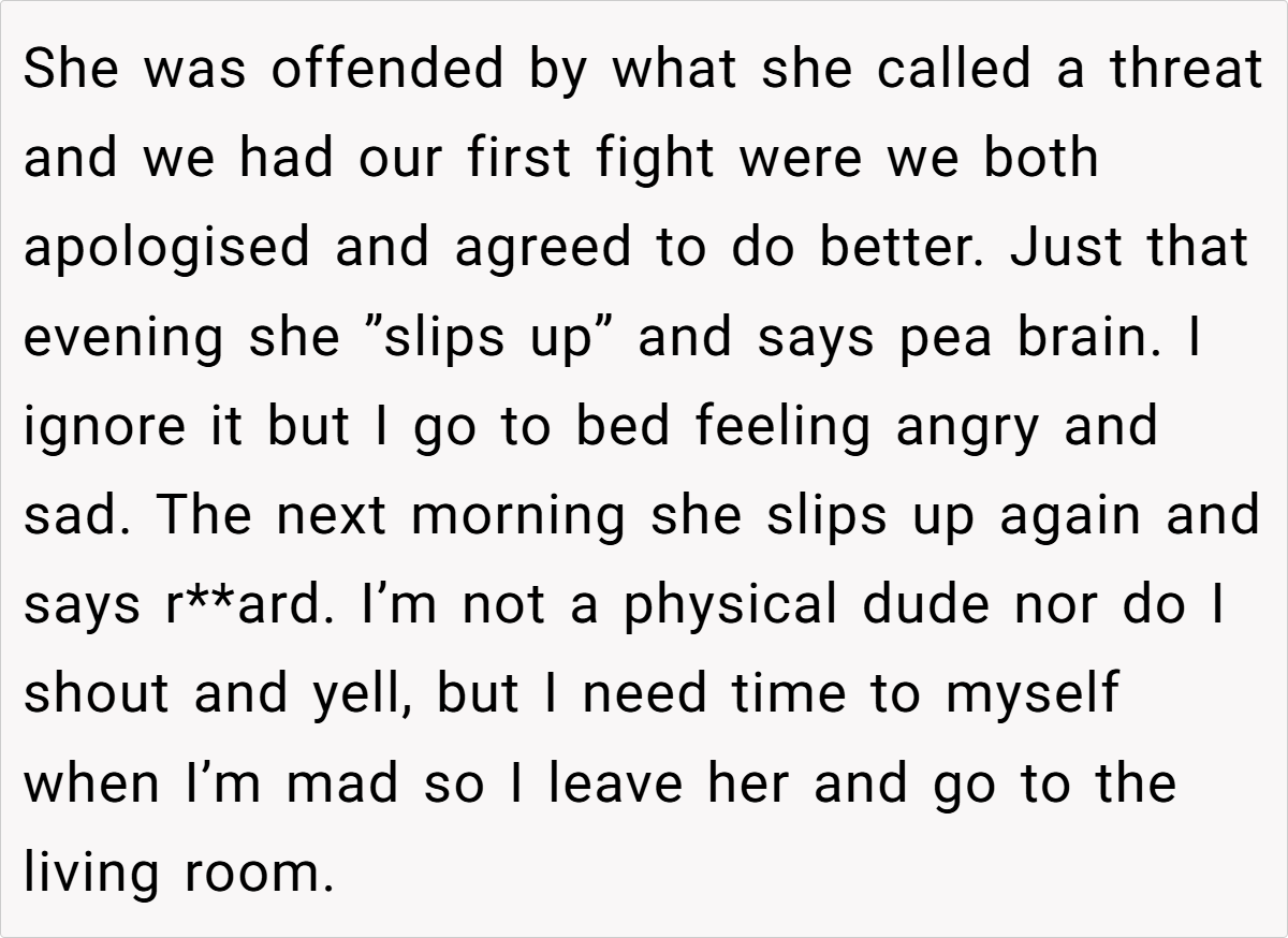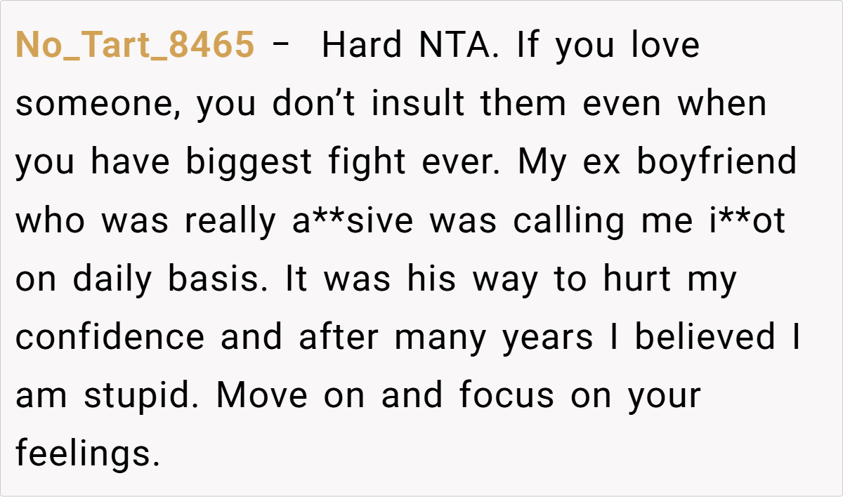 Verbal abuse in relationships is a subtle yet dangerous form of mistreatment that can erode self-esteem over time. Relationship expert Dr. John Gottman explains, “The foundation of a healthy relationship is built on respect and kindness, not on demeaning language or casual insults.” In this case, the OP’s repeated experiences with slurs—even when framed as jokes—clearly undermined the trust and respect essential for a nurturing partnership.