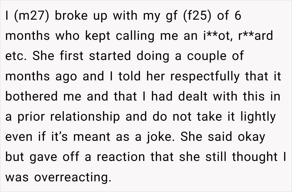 When relationships devolve into a constant barrage of insults—even under the guise of humor—it becomes impossible to ignore the toll on your self-esteem and emotional well-being. In this case, a 27-year-old man (OP) found himself repeatedly targeted with demeaning slurs like “iot” and “rard” by his 25-year-old girlfriend of six months. Despite his respectful requests to put a stop to this hurtful behavior, the issue only escalated over time, leaving him frustrated and heartbroken.