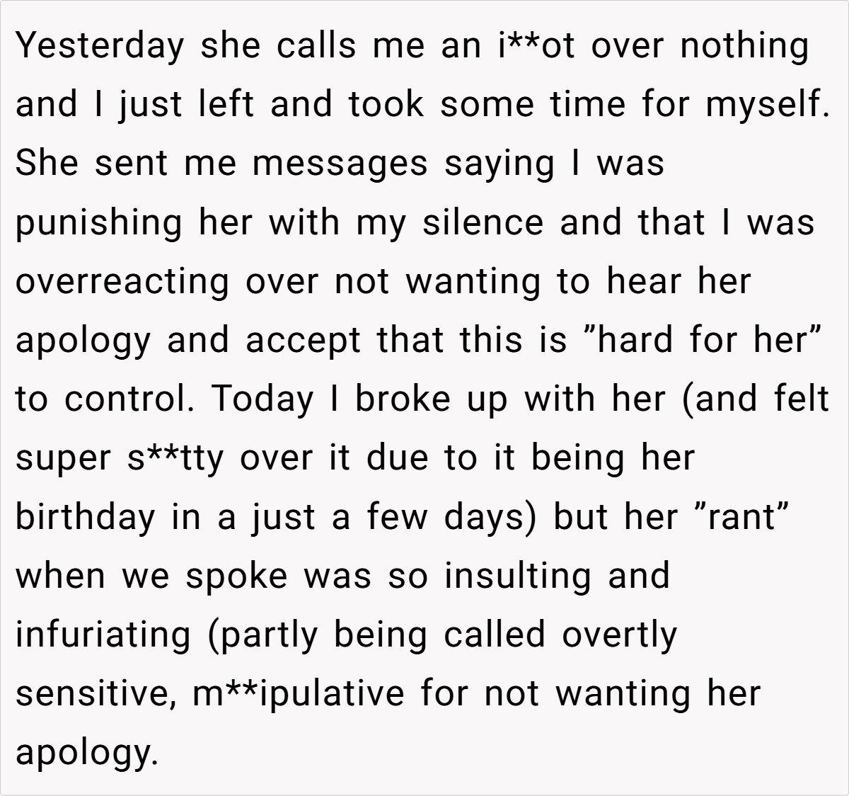 After numerous attempts at addressing the problem, including setting a clear dealbreaker, the situation reached a boiling point. The repeated verbal attacks, dismissive apologies, and blame-shifting left him with no choice but to end the relationship—even though her birthday was only days away. Is OP wrong for prioritizing his emotional health over a relationship marred by relentless disrespect? Let’s delve into the details.