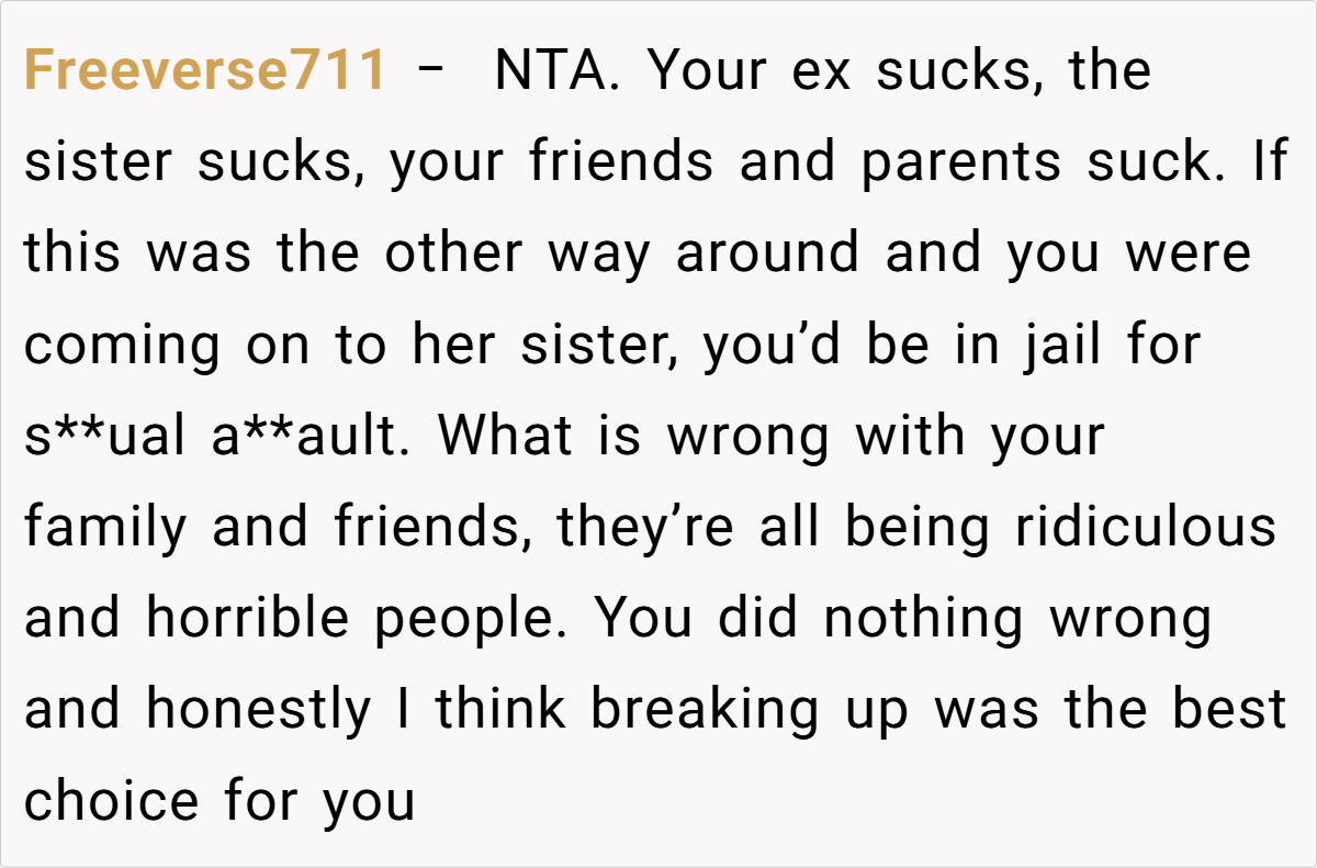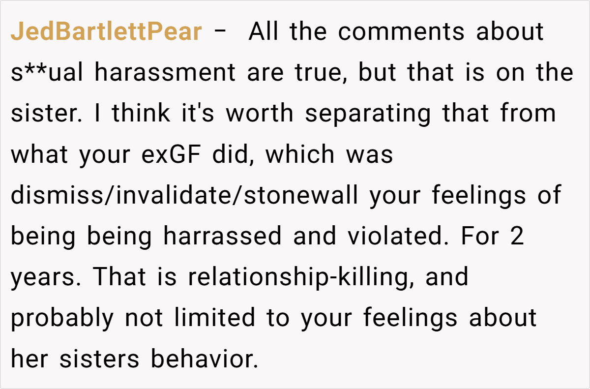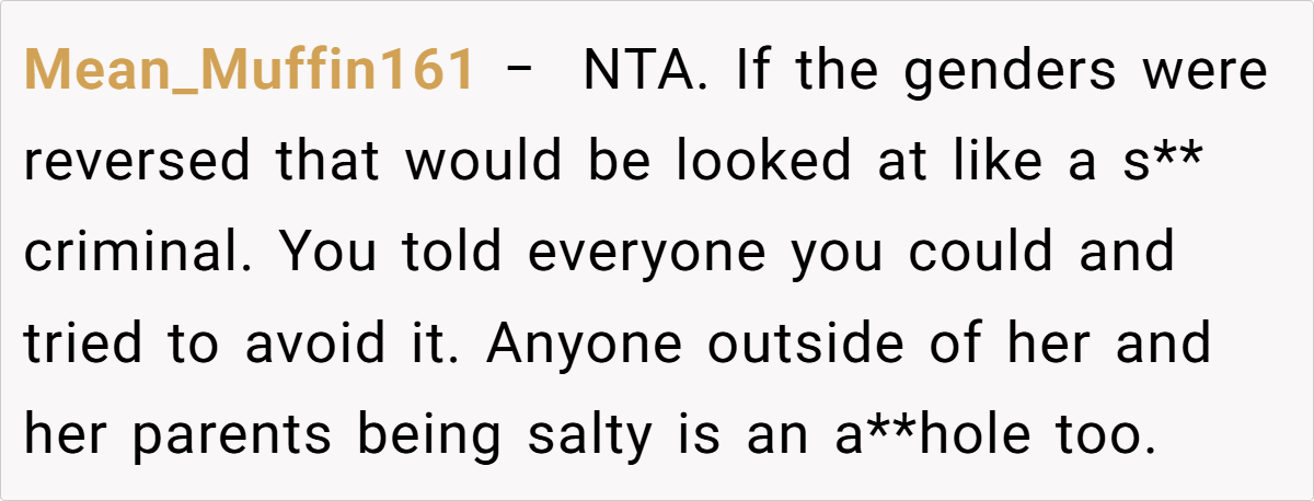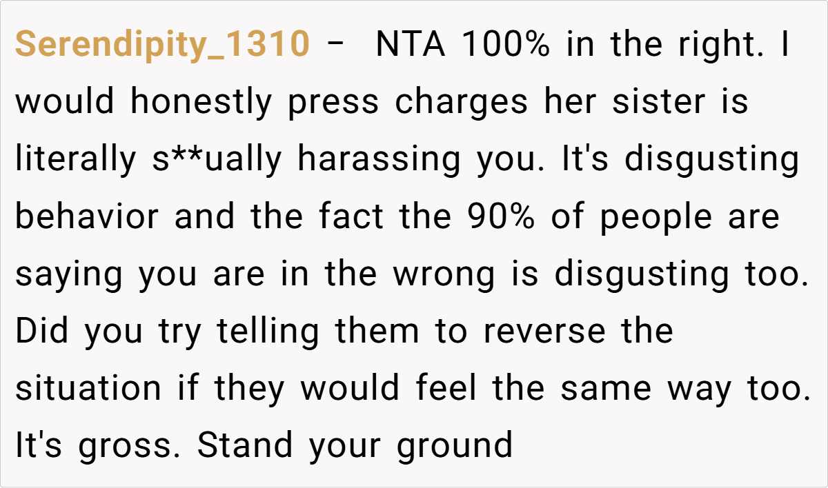 The Reddit community has been unequivocal in their support. Many commenters have called out the sister’s behavior as blatant sexual harassment, with statements such as, “This is sexual assault in disguise,” and “You did nothing wrong—your boundaries were continuously disrespected.” Others point out that the repeated warnings and clear communication should have been enough, and the fact that nothing changed is a damning indictment of her family’s inaction.