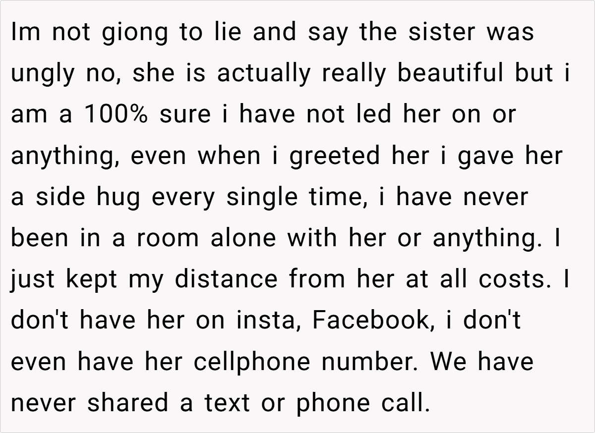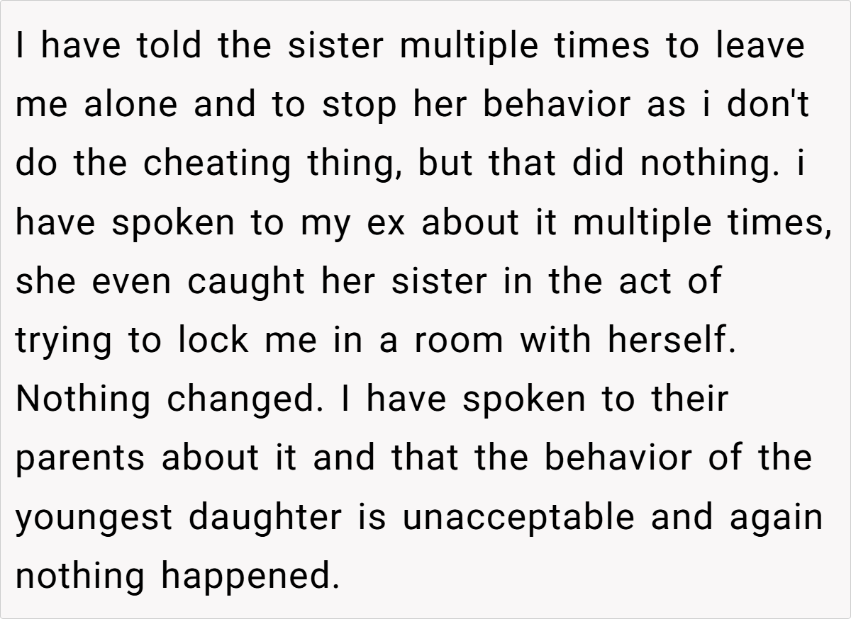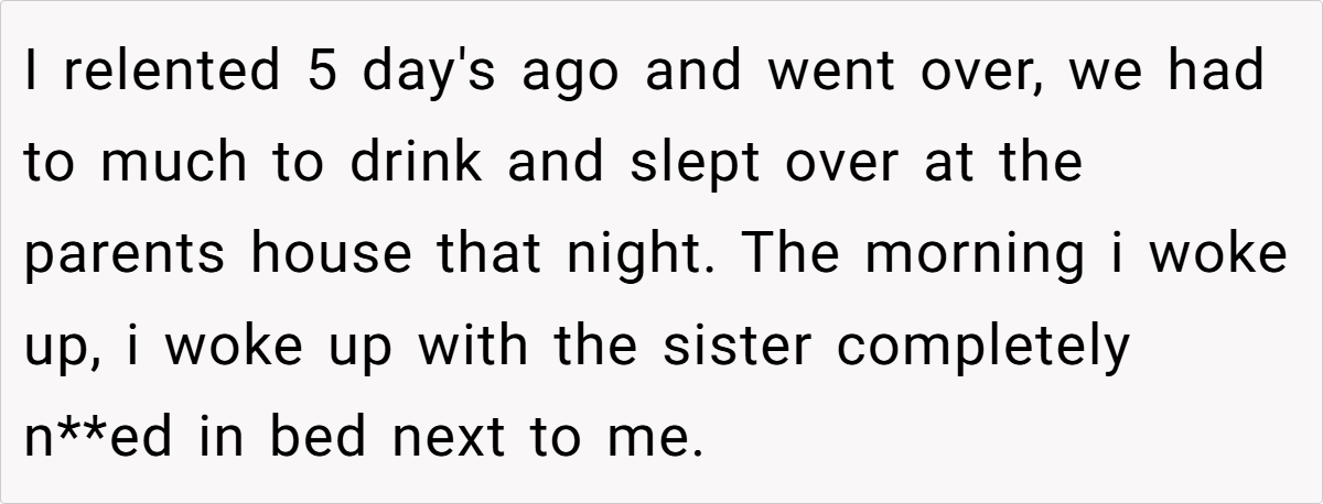 Despite my clear and constant refusals, she persistently made unwanted advances every time we met. I tried to handle the situation with maturity by speaking up and even involving her family, but nothing changed. The situation reached a boiling point when, after a night out at her parents’ house, I woke up with her sister completely naked in my bed.