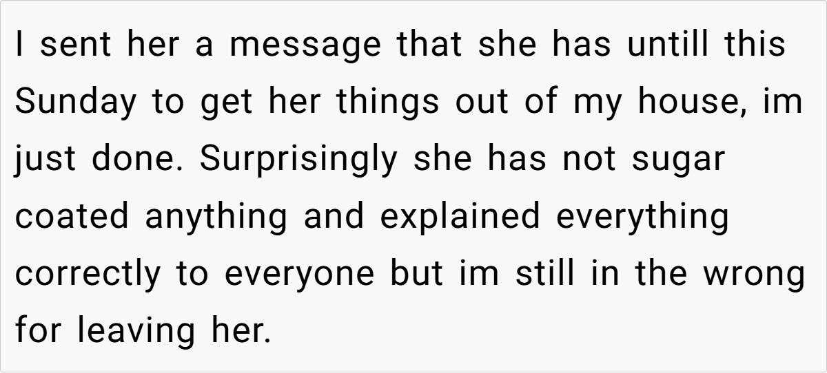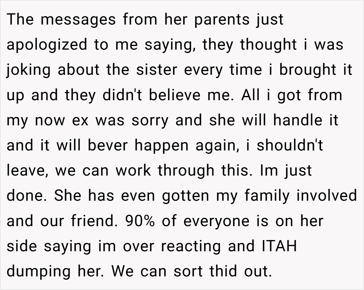 The severity of the sister’s actions not only affected my personal well-being but also highlighted the glaring lack of accountability from both my ex and her family. This breach of trust isn’t merely a momentary lapse—it’s a pattern of behavior that one cannot simply overlook.