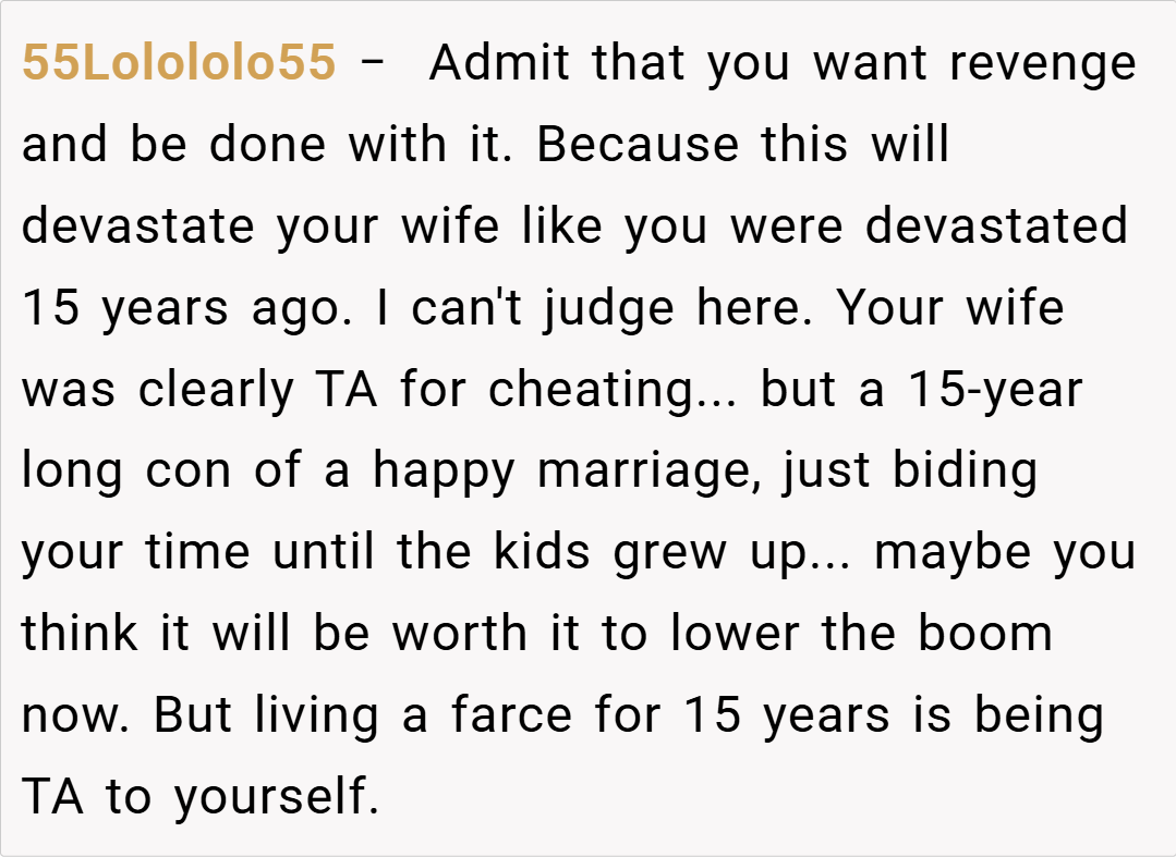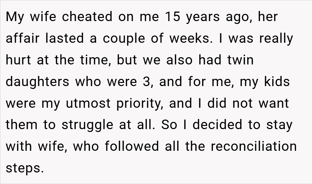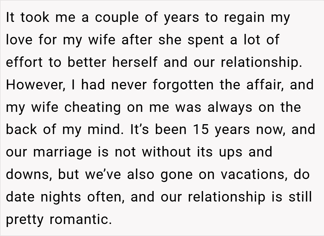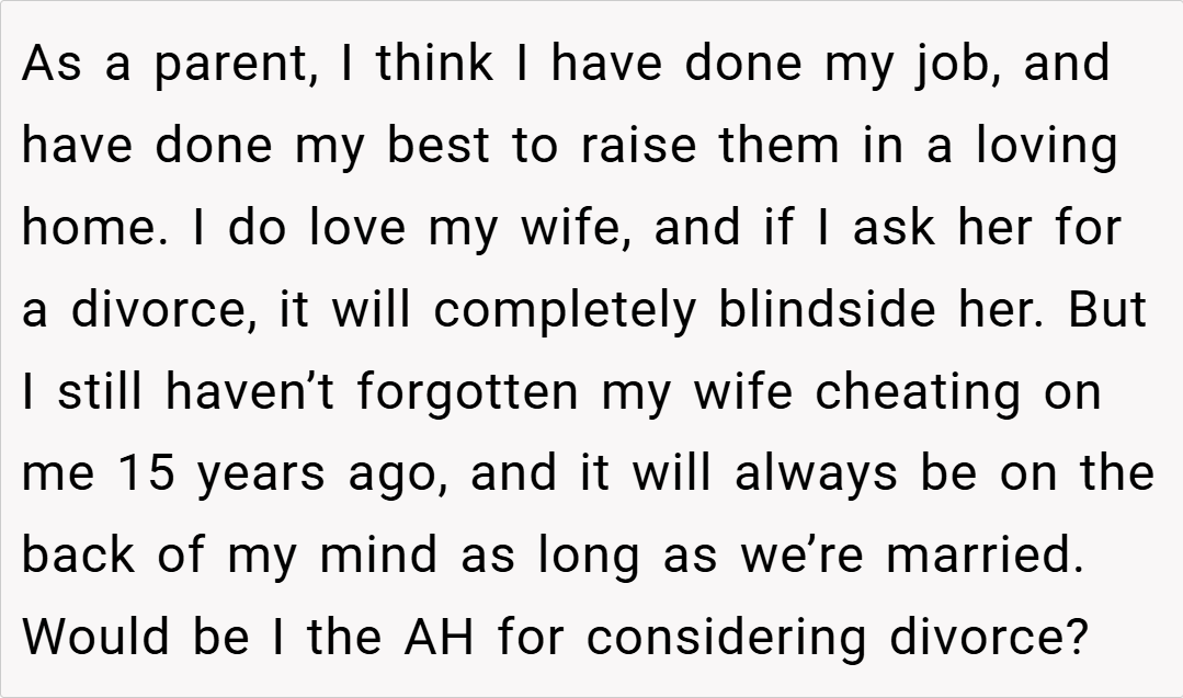 In the end, the OP’s consideration of divorce after 15 years, driven by an unresolved betrayal, is a deeply personal decision that speaks to the challenges of forgiveness and long‑term healing. While he stayed for his children and tried to rebuild trust, the lingering pain of his wife’s infidelity continues to affect him.