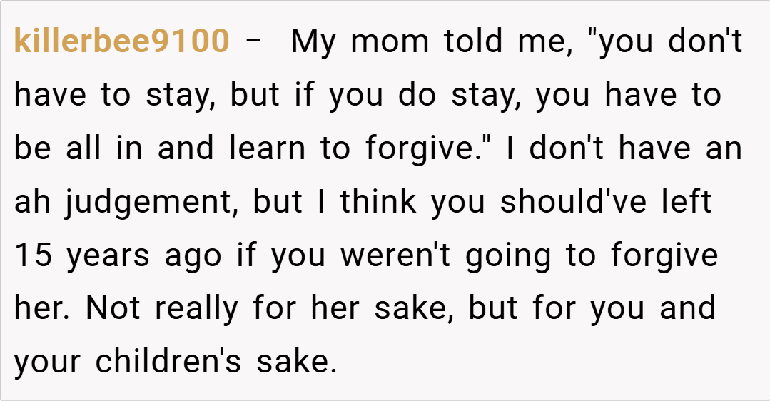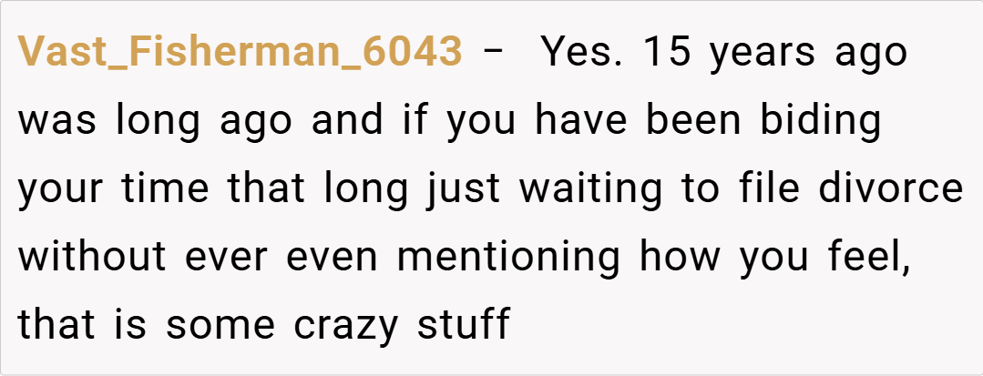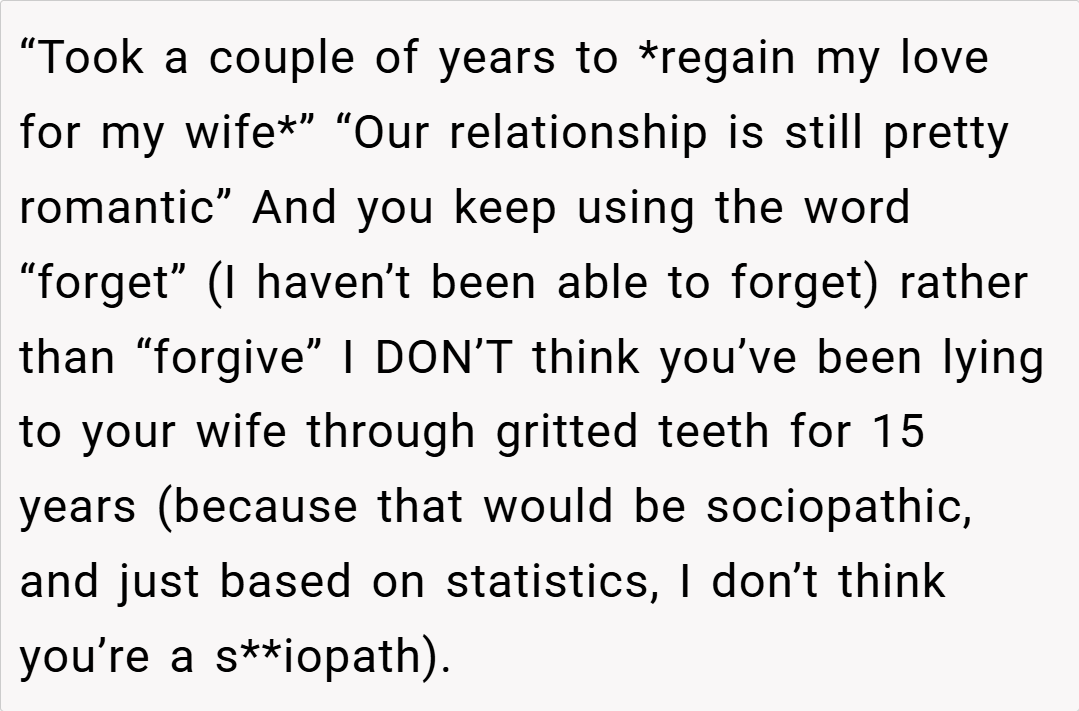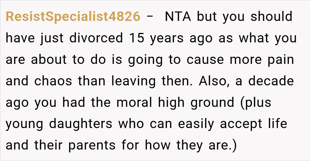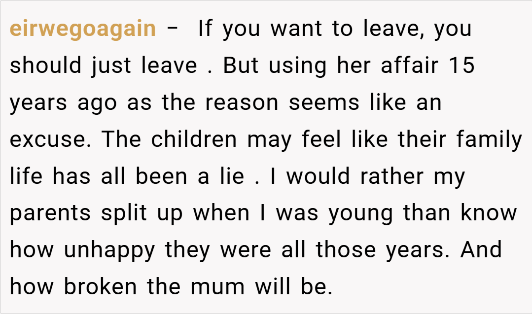 In the end, the OP’s consideration of divorce after 15 years, driven by an unresolved betrayal, is a deeply personal decision that speaks to the challenges of forgiveness and long‑term healing. While he stayed for his children and tried to rebuild trust, the lingering pain of his wife’s infidelity continues to affect him.