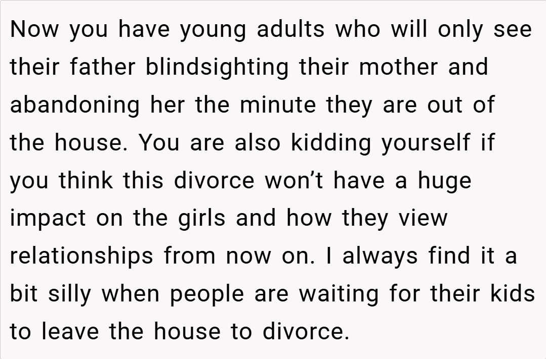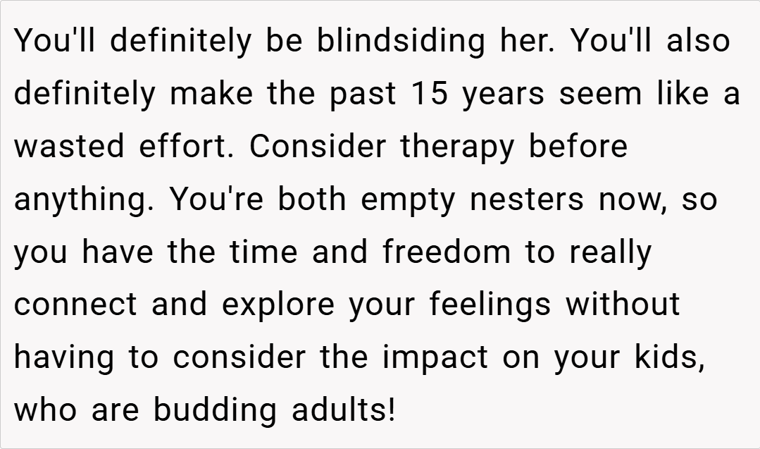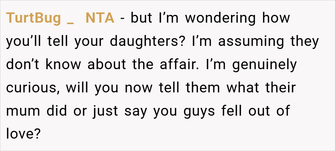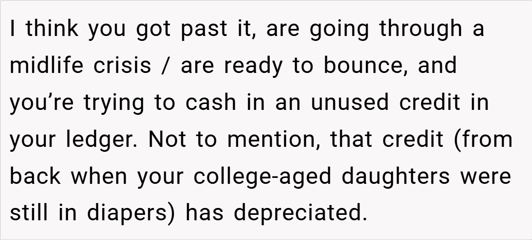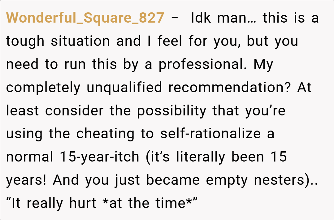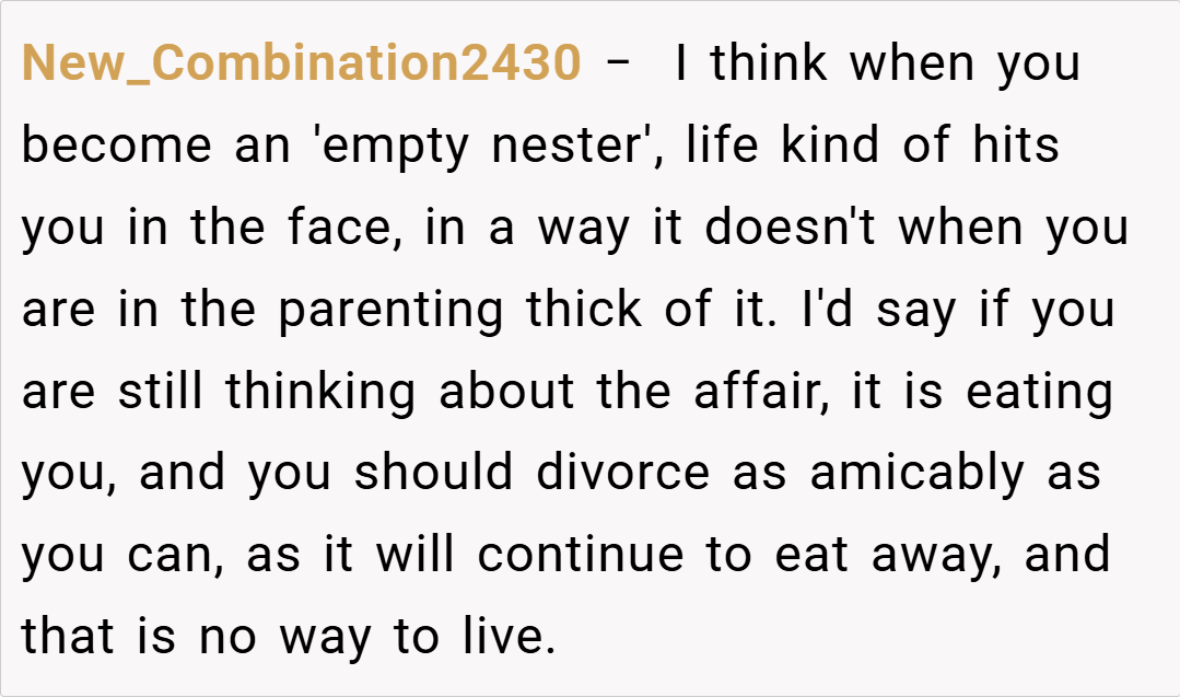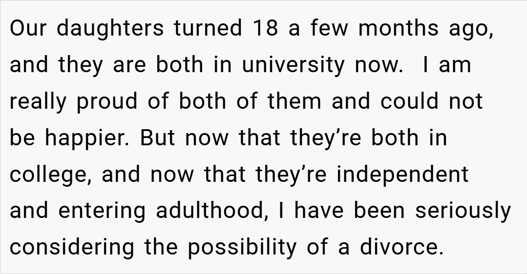 Now that their daughters have turned 18 and are off to college, our OP finds himself at a crossroads. With the kids grown and more independent, he’s seriously considering divorce. Although he still loves his wife, the hurt from her past betrayal remains an unhealed wound.