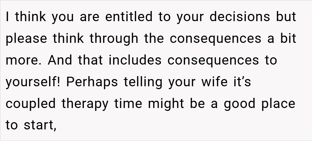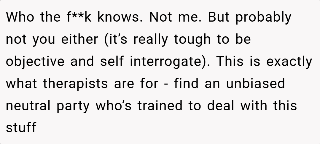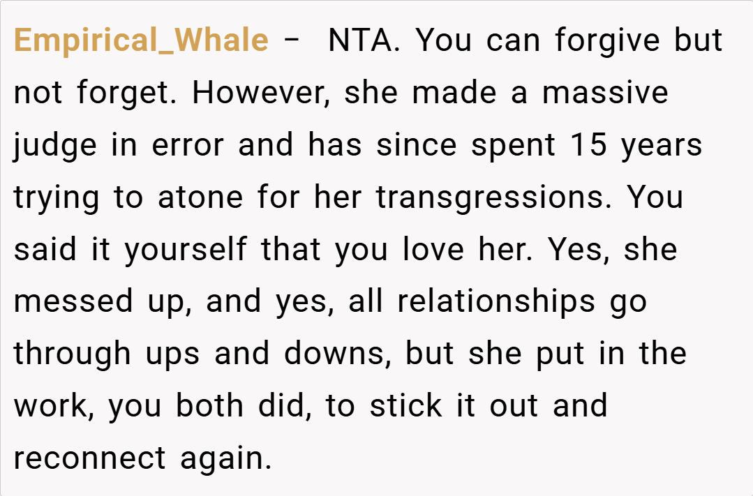 The OP’s consideration of divorce—though heartbreaking—reflects a need for personal healing and the desire to live free from constant emotional strain. His inner conflict is not a matter of being ungrateful or unloving; it’s about the reality that unresolved pain can undermine the quality of a relationship, even after many years.