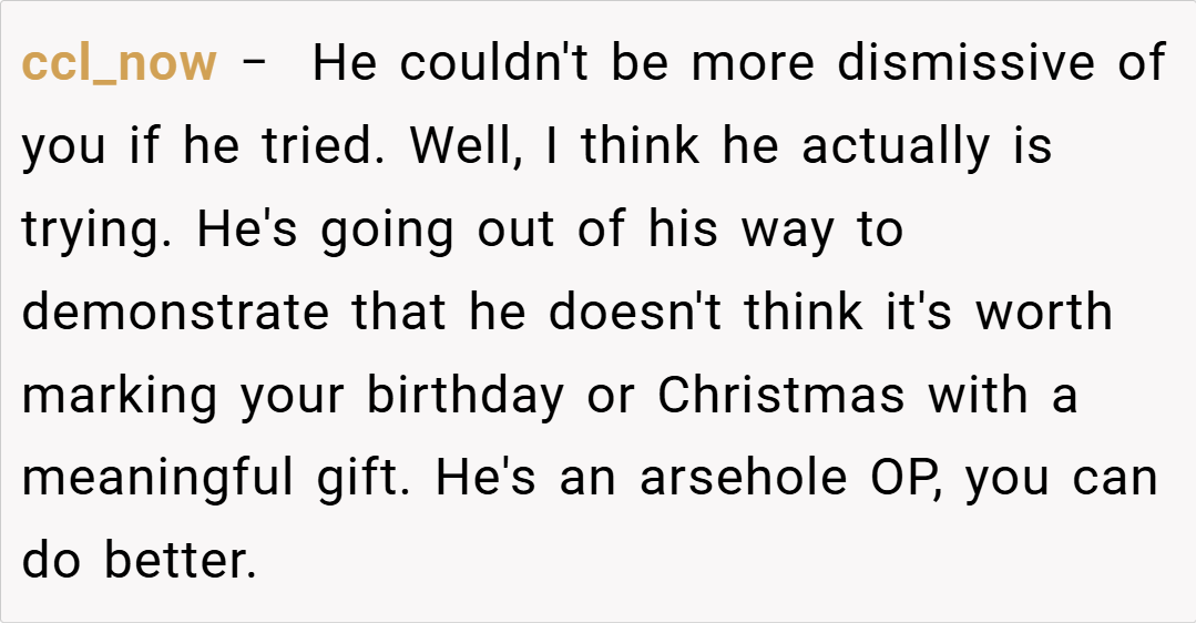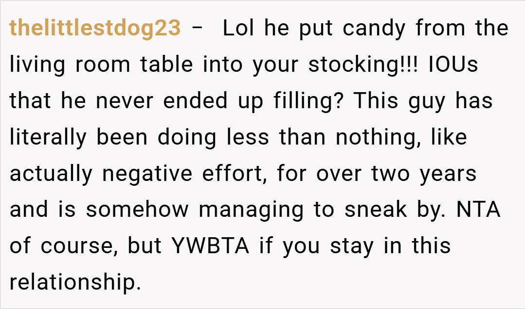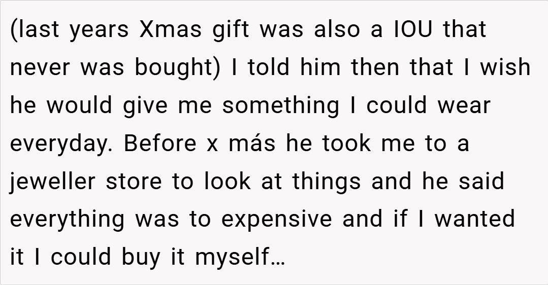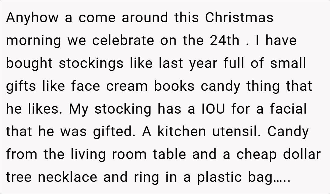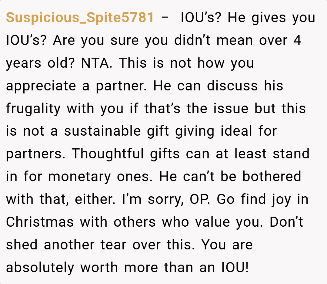 For her, these small tokens weren’t just material items but symbols of his lack of commitment. After a series of IOU presents and dismissive comments about expensive jewelry—like when he casually told her that she could buy what she wanted—the final straw on Christmas morning left her overwhelmed. Now she’s left wondering if her emotional reaction, which ended in tears, makes her the asshole for demanding more from a partner who should know how to celebrate her.