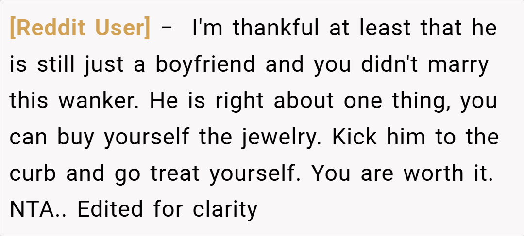 Many redditors empathize with the OP’s frustration, noting that in a high‑earning, successful relationship, it’s reasonable to expect thoughtful, meaningful gifts. “After years of empty IOUs, receiving a dollar store necklace isn’t just a cheap present—it’s a symbol that you’re not a priority,” one commenter stated. They applaud her emotional response as a wake‑up call that she deserves better.