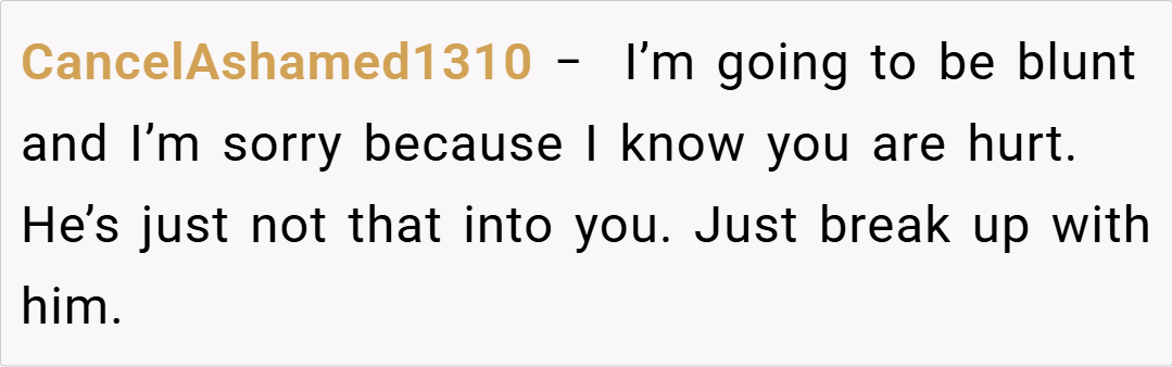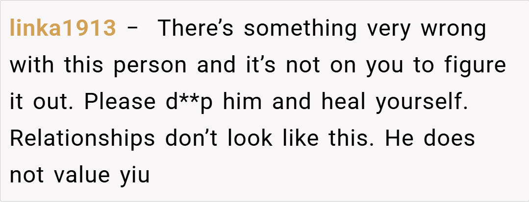 Similarly, family therapist Dr. Susan Johnson notes, “In mature relationships, partners should communicate openly about what makes them feel valued. When those conversations are repeatedly ignored, it’s natural to become deeply hurt—even to the point of tears.” Both experts agree that the OP’s emotional response, though painful to witness, is a reflection of deeper issues within the relationship that have been left unaddressed over time.