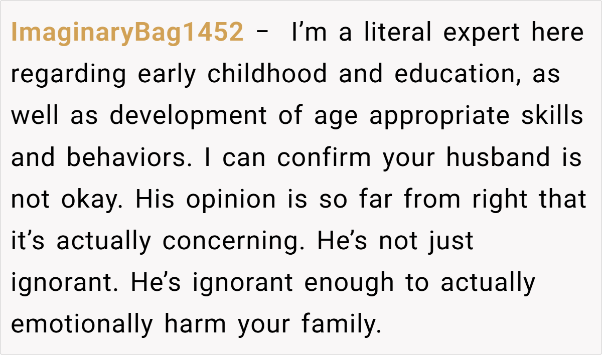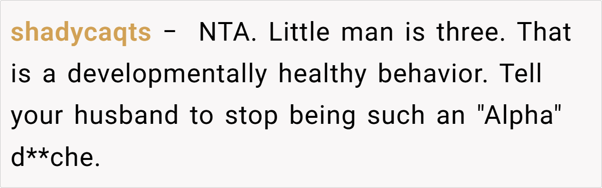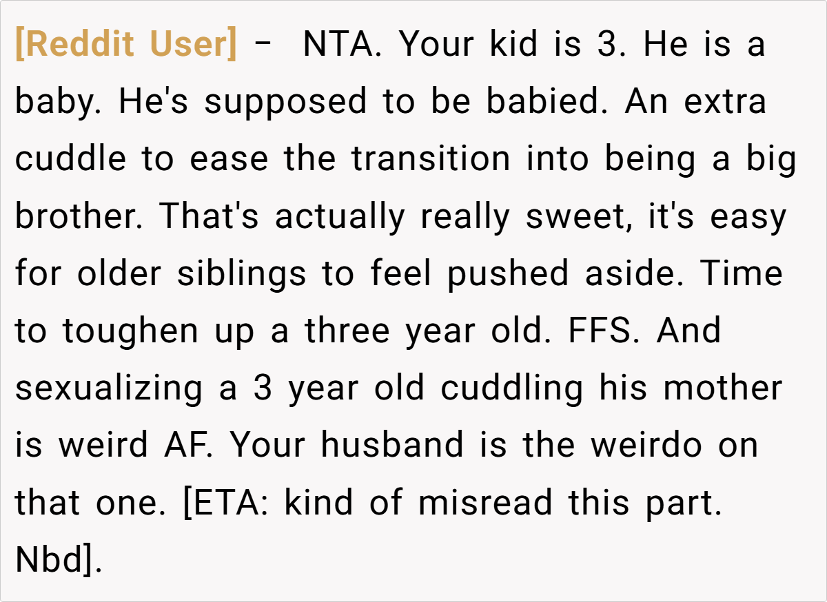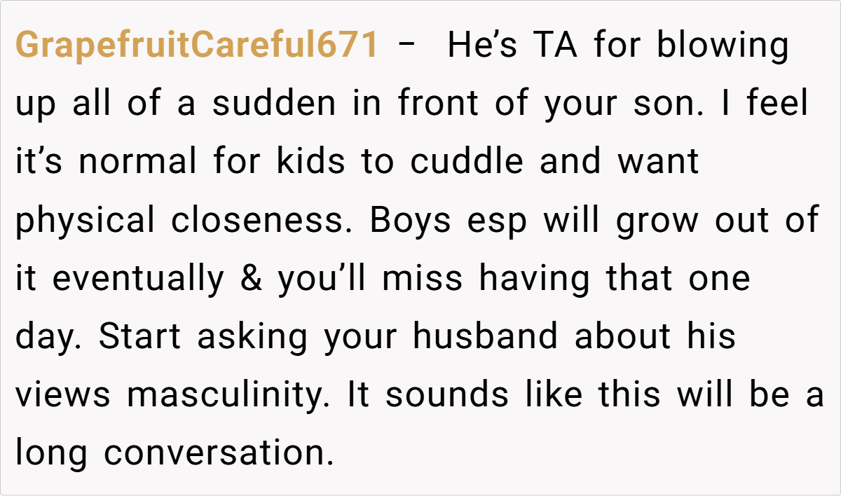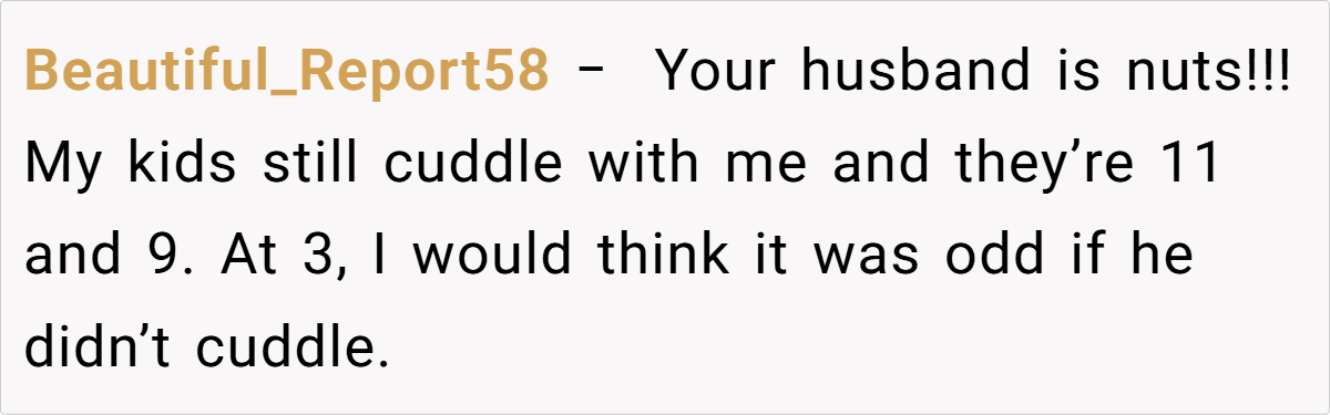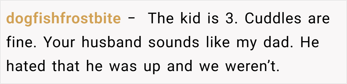 Reddit users overwhelmingly sided with the mom. Many argued that at three years old, seeking cuddles is perfectly natural, and that the husband’s reaction seemed more like an overblown display of outdated notions of masculinity than a genuine concern for the child’s well-being.
