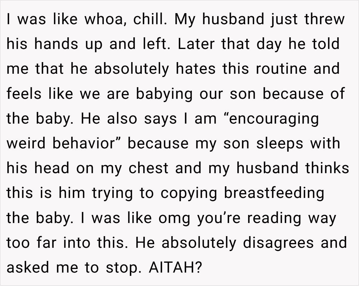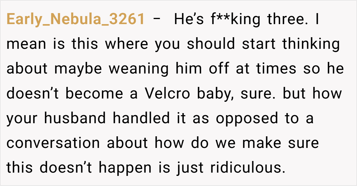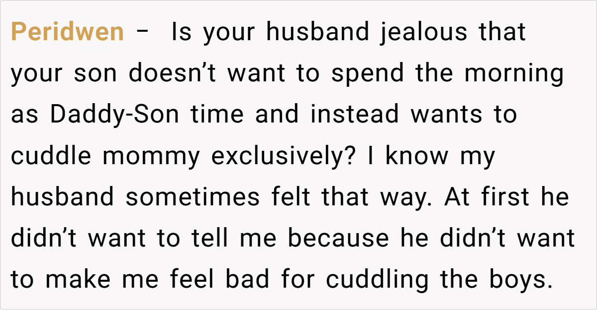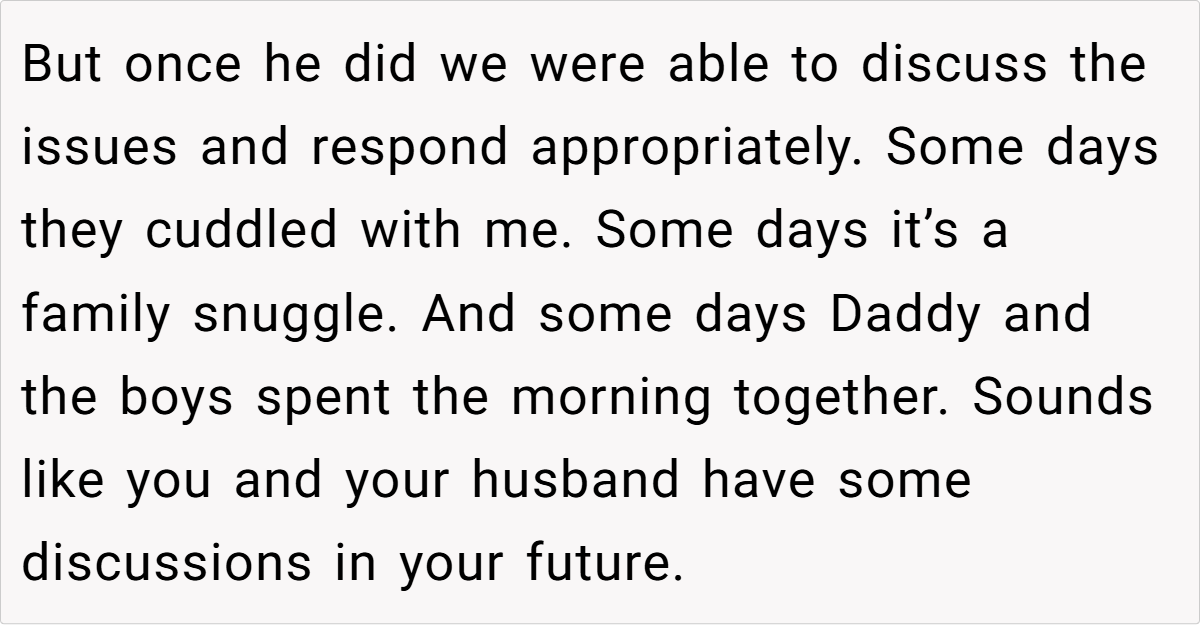 At the heart of this story lies a clash of parenting philosophies and personal insecurities. While the mom’s decision to offer extra cuddles reflects a nurturing approach that fosters secure attachment, the husband’s reaction underscores a need for open dialogue about family roles and personal comfort.