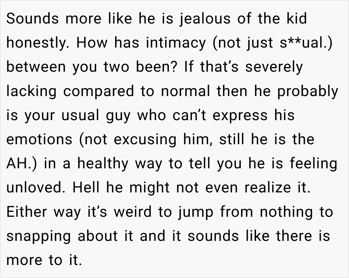 Comments ranged from humorous jabs—“he’s f**king three”—to serious critiques suggesting that his outburst might be masking deeper feelings of insecurity or jealousy. A few users also highlighted that children benefit from physical affection, especially during times of change, and urged the husband to reconsider his stance and engage in a constructive conversation about his concerns.