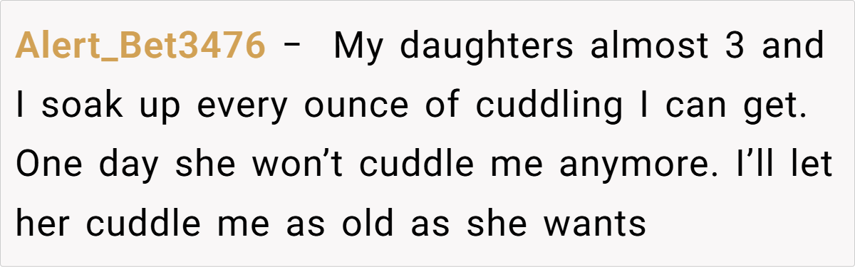 Rather than framing the child’s behavior as “weird” or problematic, this balanced approach encourages understanding that a little extra cuddling can be a healthy expression of love—provided it doesn’t interfere with family dynamics.