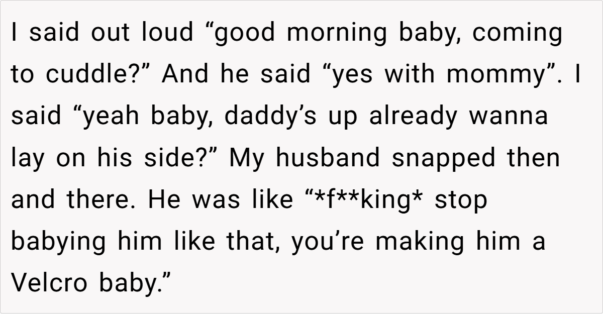 The tension came to a head one Sunday morning when the simple greeting, “Good morning baby, coming to cuddle?” led to a sharp retort from her husband. His explosive remark—warning that she was turning their son into a “Velcro baby”—left both parents and the little one caught in the crossfire. This incident raises questions about parenting styles, expectations, and how differing views on affection and routine can lead to family strife.