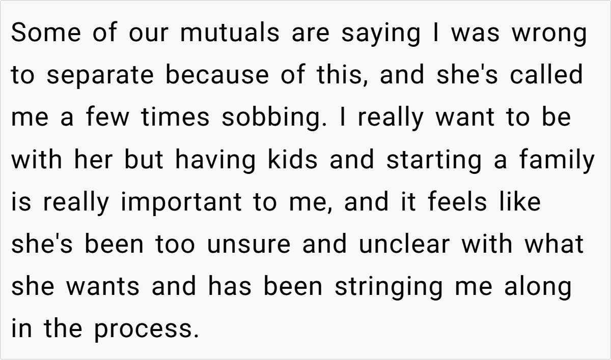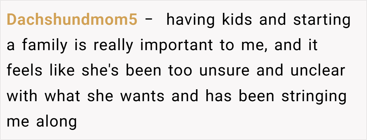 In cases where one partner feels stringed along with ambiguous responses, it might signal deeper issues of incompatibility rather than a simple difference in timing. Sometimes, even with counseling, the core differences in life plans—such as when or if to have children—prove to be non-negotiable. Ultimately, acknowledging these differences early can prevent prolonged heartache and allow both individuals to find paths that truly fulfill them.