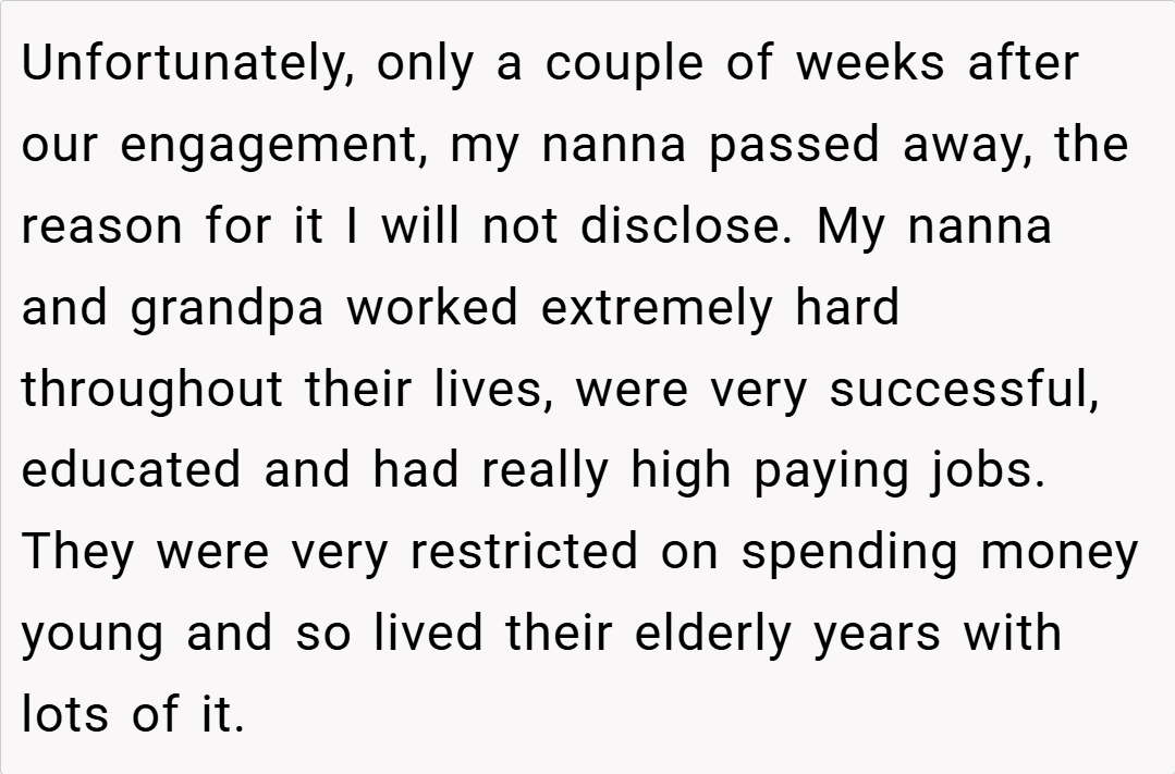 When money and marriage mix, family dynamics can quickly become a powder keg. In this emotionally charged situation, our OP, a 32‑year‑old woman, recently got engaged after a five‑year relationship and had big plans for her wedding in May 2025. Not long after the engagement, tragedy struck with the passing of her nanna, who left behind a generous inheritance meant for her and several other relatives.
