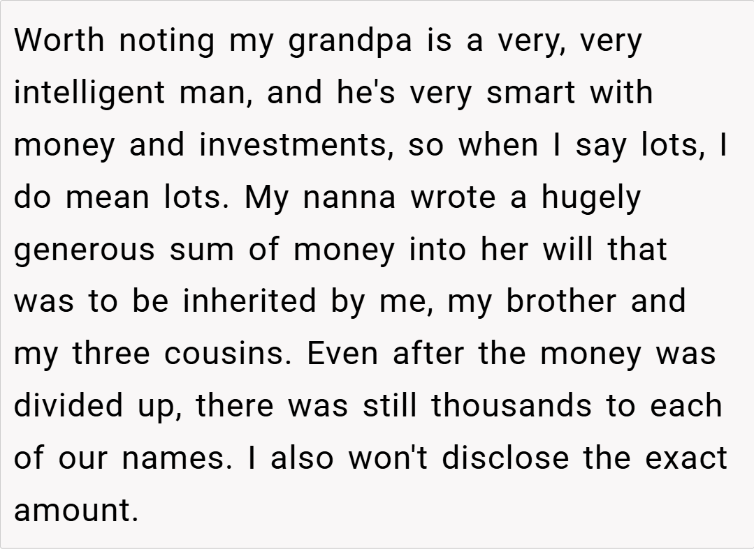 For the OP, years of careful planning and the sentimental value attached to her nanna’s legacy fueled her reaction. She sees the inheritance as not just money, but as a symbol of her family’s sacrifices and a reward for her personal connection with her late nanna. Family therapist Dr. Susan Johnson adds, “Financial disputes in relationships are often a reflection of deeper issues related to trust and respect.