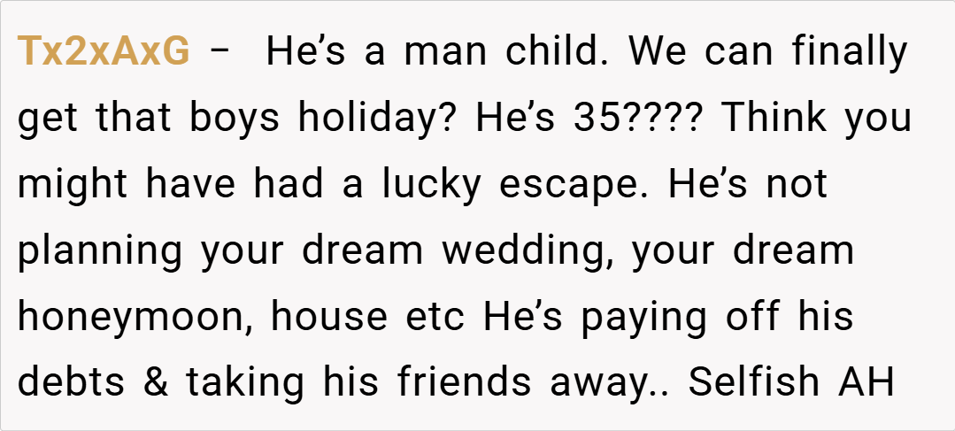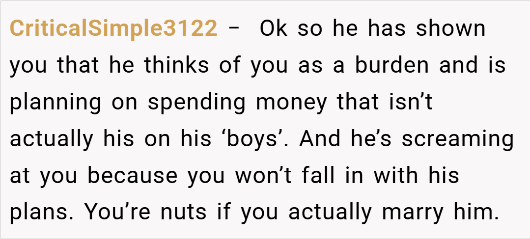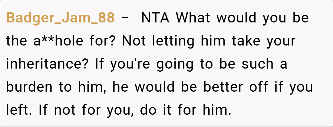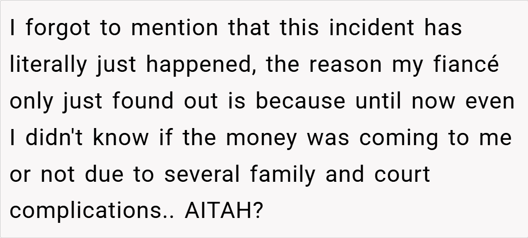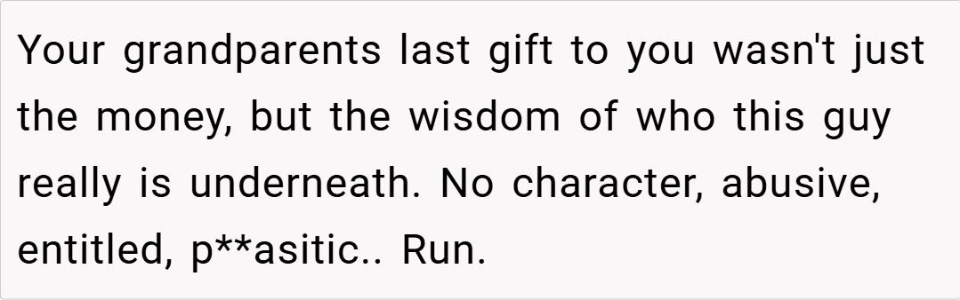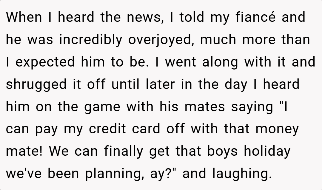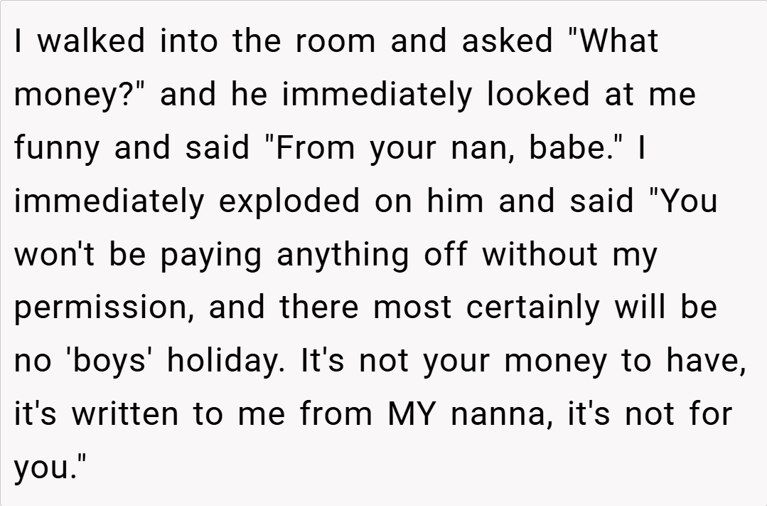The OP was initially pleased to share the news with her fiancé—until she overheard him boasting to his friends about paying off his credit card and planning a “boys’ holiday” using her nanna’s money. Her reaction was swift and fiery: she told him, in no uncertain terms, that the inheritance was hers by virtue of her nanna’s wishes and that his financial expectations were entirely misplaced.