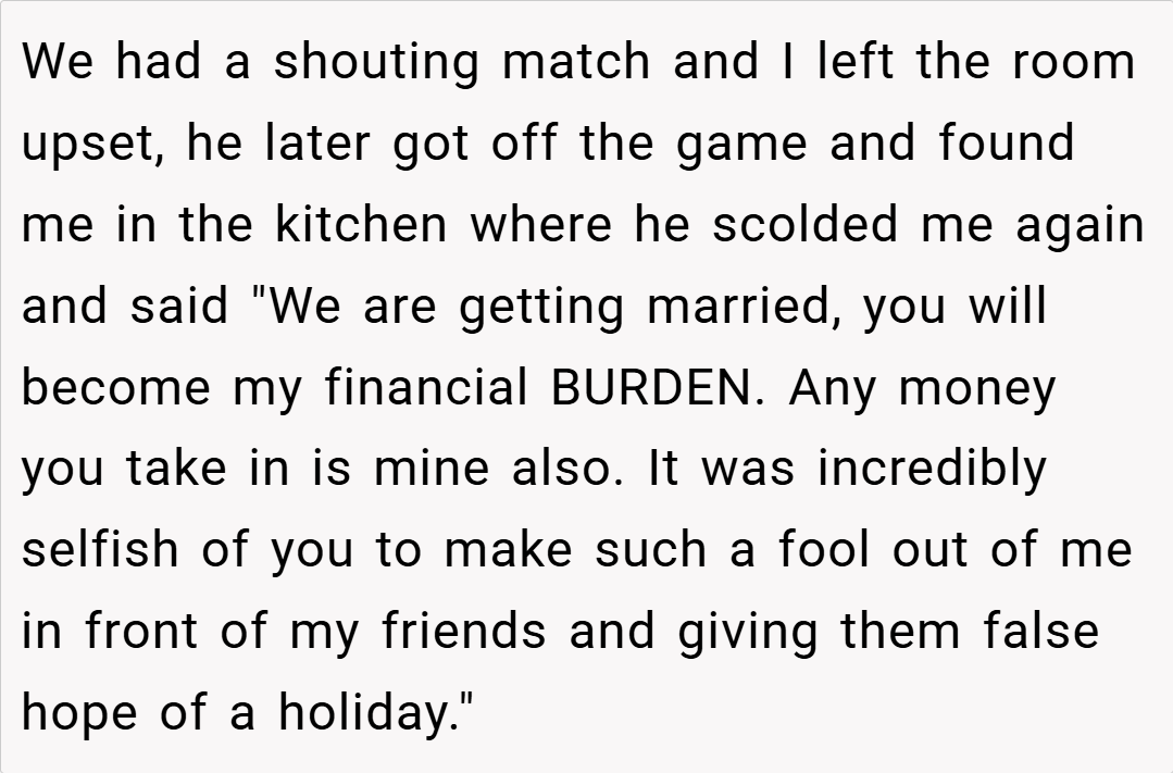 It is also important to note that inheritances can be particularly sensitive topics in blended relationships. The OP’s fiancé’s cavalier attitude towards the money, joking about holiday plans, likely struck a nerve because it trivialized a deeply personal and emotional legacy. Rather than a petty squabble, this conflict is symptomatic of differing values regarding money, family, and respect.